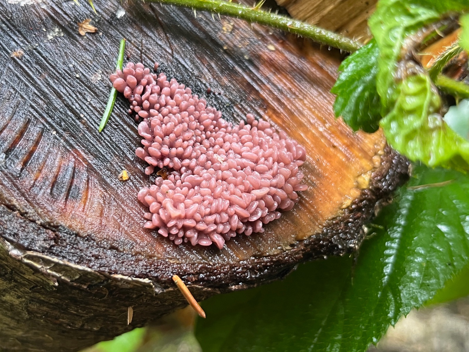 Die waren Ăźberall: Rosa Rettichhelmlinge...auf dem Baumstamm links ist auch noch was Pilziges, das ich nicht entziffern konnte.