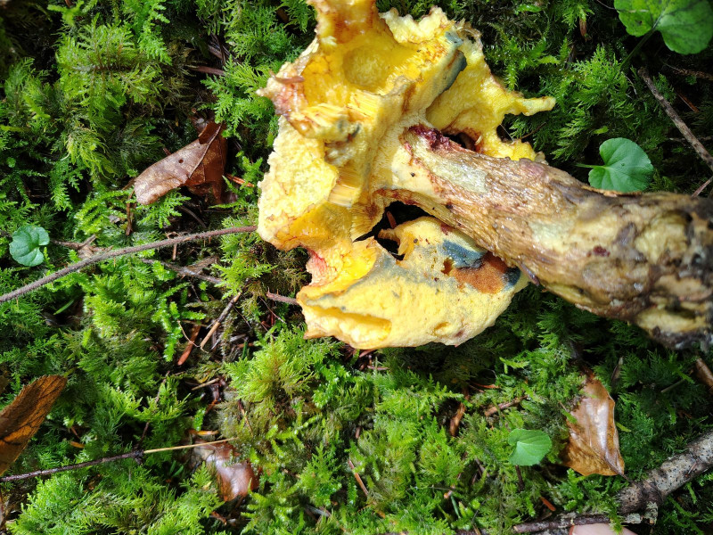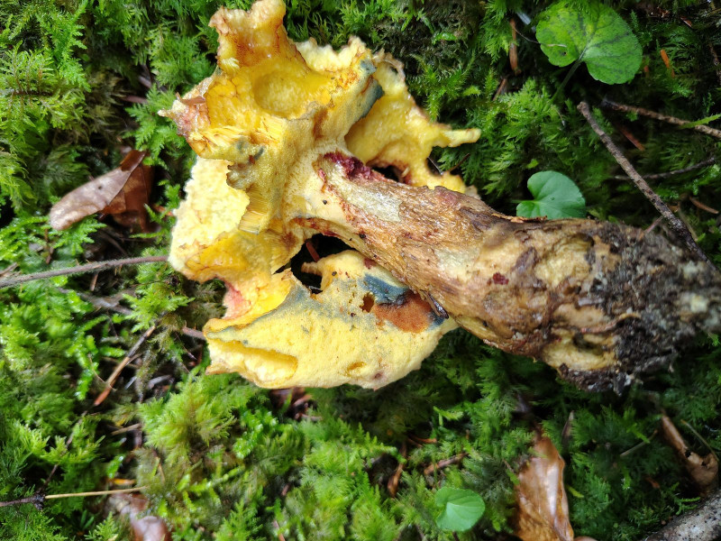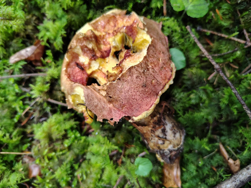 schon wieder ein komischer Butyriboletus, schon wieder leider in etwas traurigem Zustand. Gefunden im Kalknadelwald bei uralten Tannen, aber auch junge Fichten und eine sehr junge (~5m) Buche in der Nähe. Geschmack mild, Röhren auf Druck praktisch sofort blauend, Fleisch langsam im Hut. Deutliche Rottöne auf dem Hut, die auch kein Kameraeffekt sind. Leise Hoffnung ist natürlich B. roseogriseus, da das Habitat ökologisch sehr nahe an der Originalbeschreibung liegt. Ich denke aber das wird auf appendiculatus rauslaufen aber so rot?