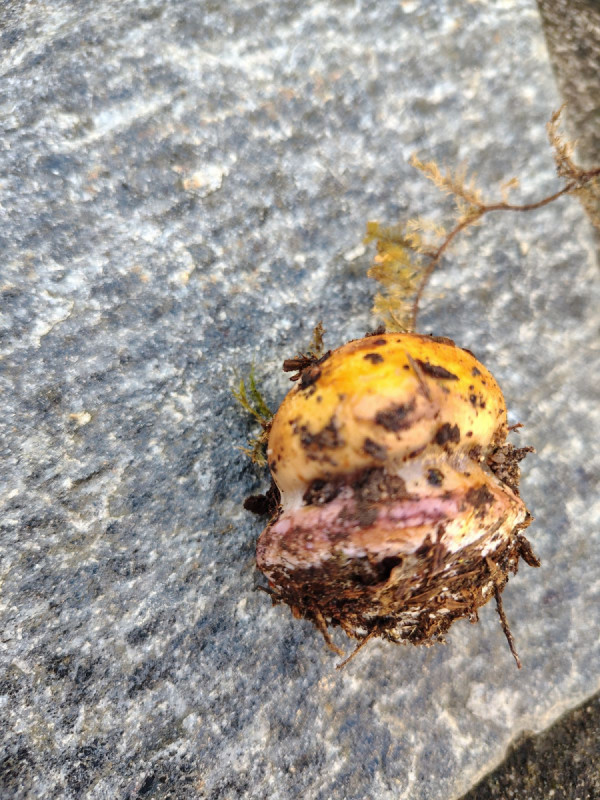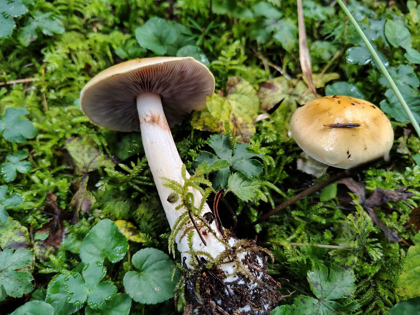 Was mich etwas stutzig macht ist, dass vor allem die Intensität des Gelbs der Hutfarbe ziemlicb variabel ist. Allen gemeinsam ist der eher leichte Violettschimmer in den Lamellen und an der Stielspitze, dir kräftig gerandete Knolle und das weiße (!) Basismyzel. Der ganz junge Fruchtkörper hatte weiße Velumpacken oben auf dem Hut, die sonst keiner hatte.