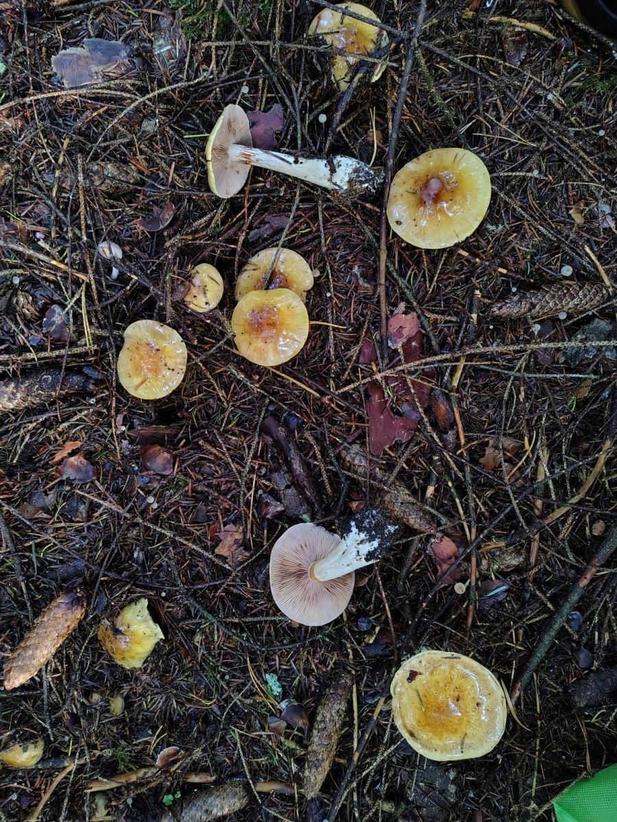 5. So. Ich denke einer aber eventuell auch mehrere herrliche Calochroi. Bei uralten Tannen, jungen Fichten und einer 5m Buche auf kräftigem Kalkboden ein riesiges Myzel dieser Art mit bestimmt 40 Fruchtkörpern. Erstmal die volle Kollektion:
