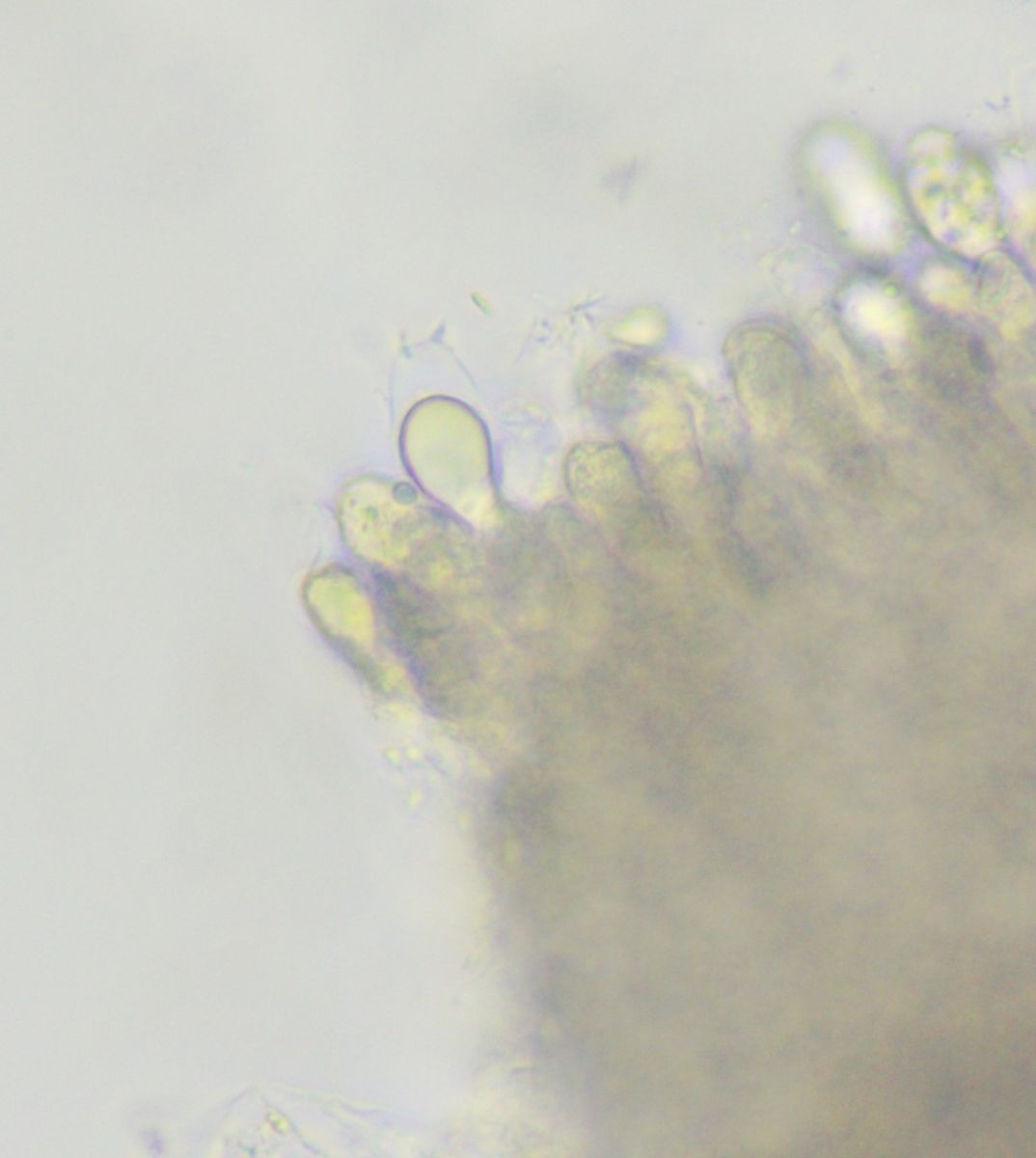 Ist das, was so einheitlich gefärbt bei den Basidien steht, eine Marginalzelle? Der Inhalt war beim Durchscrollen durch den gesamten Fokalbereich so einheitlich gefärbt, nicht so krusselig wie bei den Basidien. Die Maße dieser Zelle (wenn ich nur den oberen hellblauen Teil messe) würden dann zu dem passen, was in PdS steht für die Marginalzellen (das sind 16x13 µm, PdS schreibt "Marginalzellen blasig, 15-20 x 12-15 µm"). Allerdings sehen die auf der dortigen Zeichnung doppelwandig aus, sowas sehe ich hier nicht. Ich hätte ja gerne mit Mikro-Fotos aus dem Internet verglichen, habe aber keine gefunden.