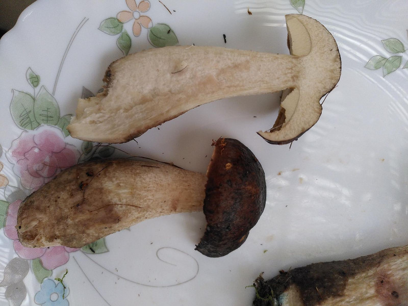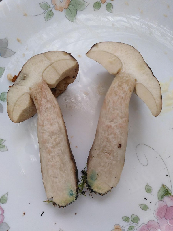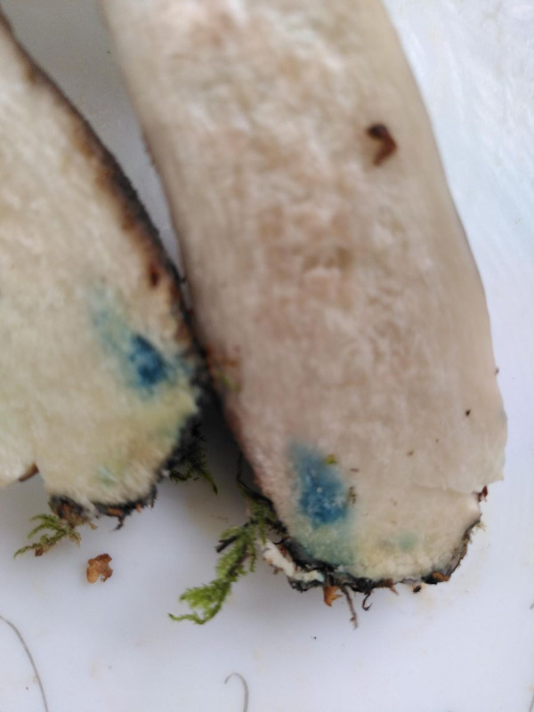 Nummer 2: dunkelbrauner Hut, selbe Birke: kräftige Blaufärbung in der Stielbasis: