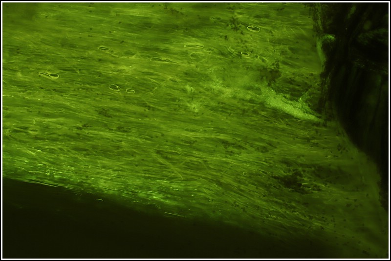 der Grünblättrige Schwefelkopf fluoresziert auch im Mikroskop. Das tun wenige Pilze. Hier zwei Bilder von der Stielrinde.