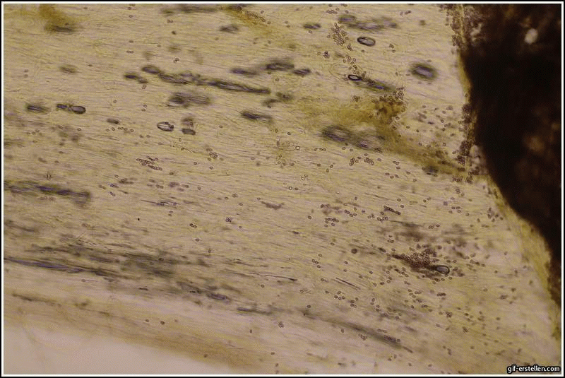 Bild 1 im normalen Hellfeld. Man kann die braunen Sporen als braune Pünktchen noch erkennen, die am Stiel hängen geblieben sind.