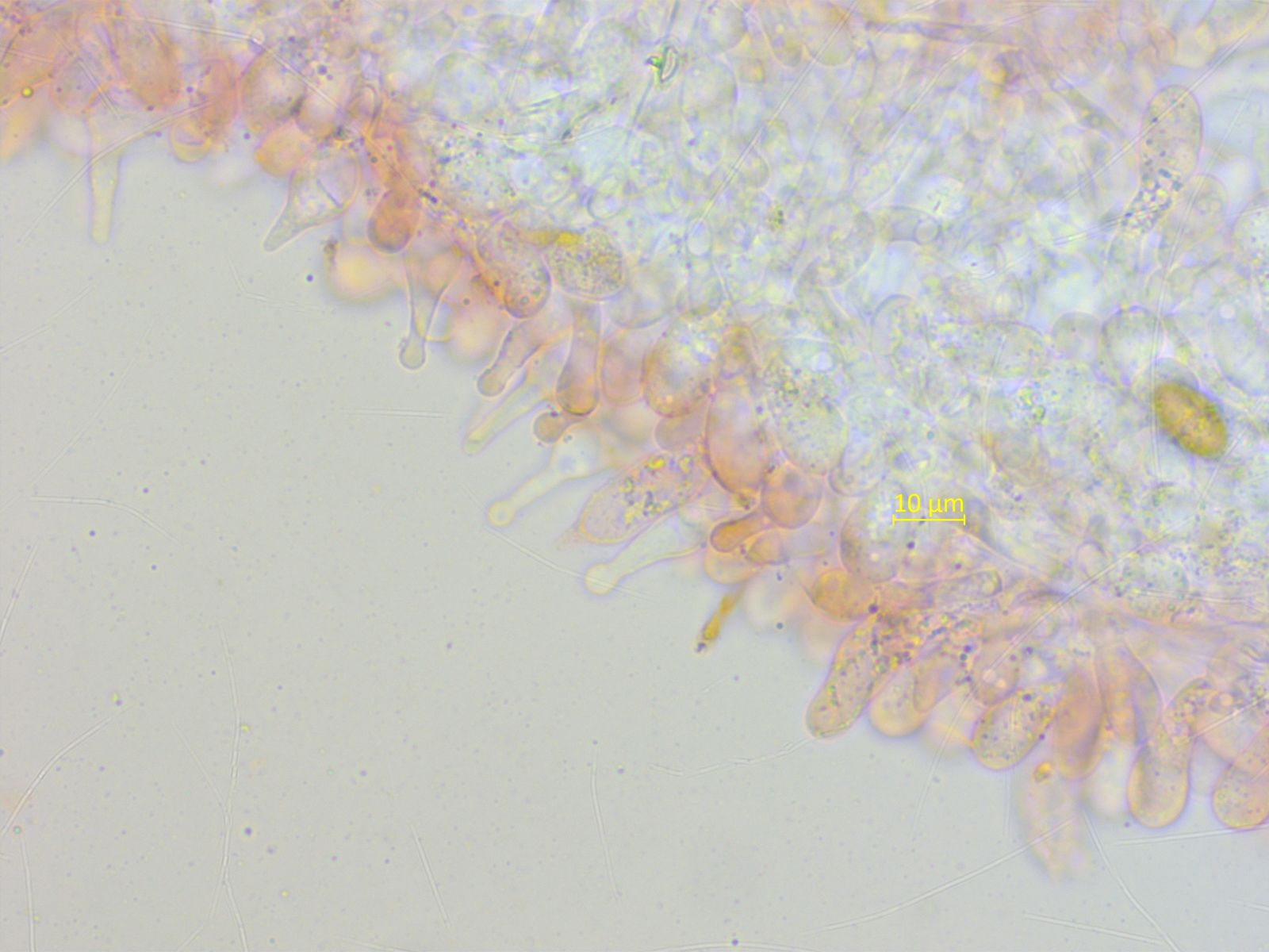Cheilozystiden fusiform mit langem Hals und dickem Bauchteil.