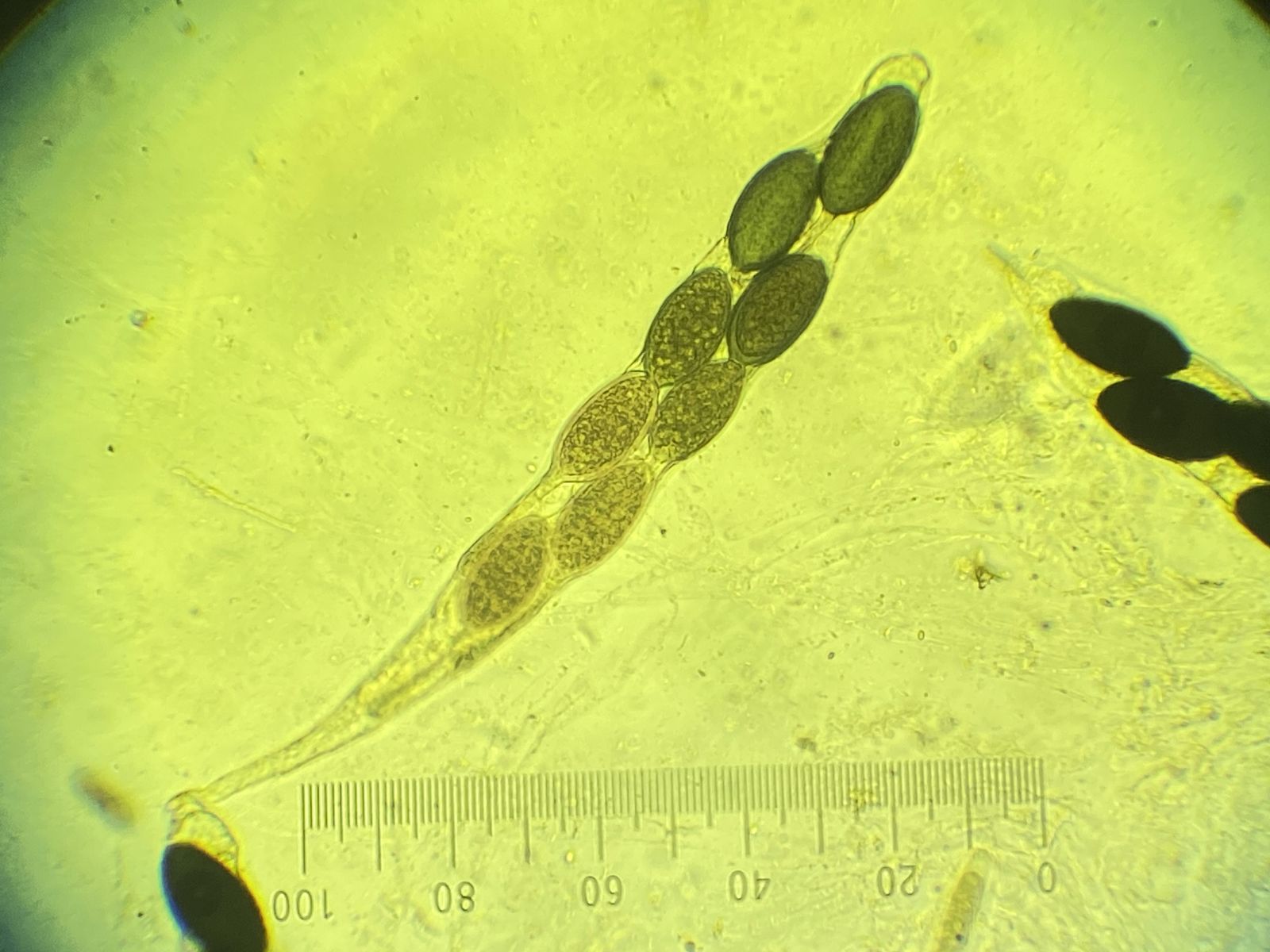 D) Ascoma schwarz, haarig; 8 Ascosporen pro Ascus, J-; Asci ca. 250 x 40-50; Ascosporen 50-60 x 25-30 µm, leicht kopfige Paraphysen