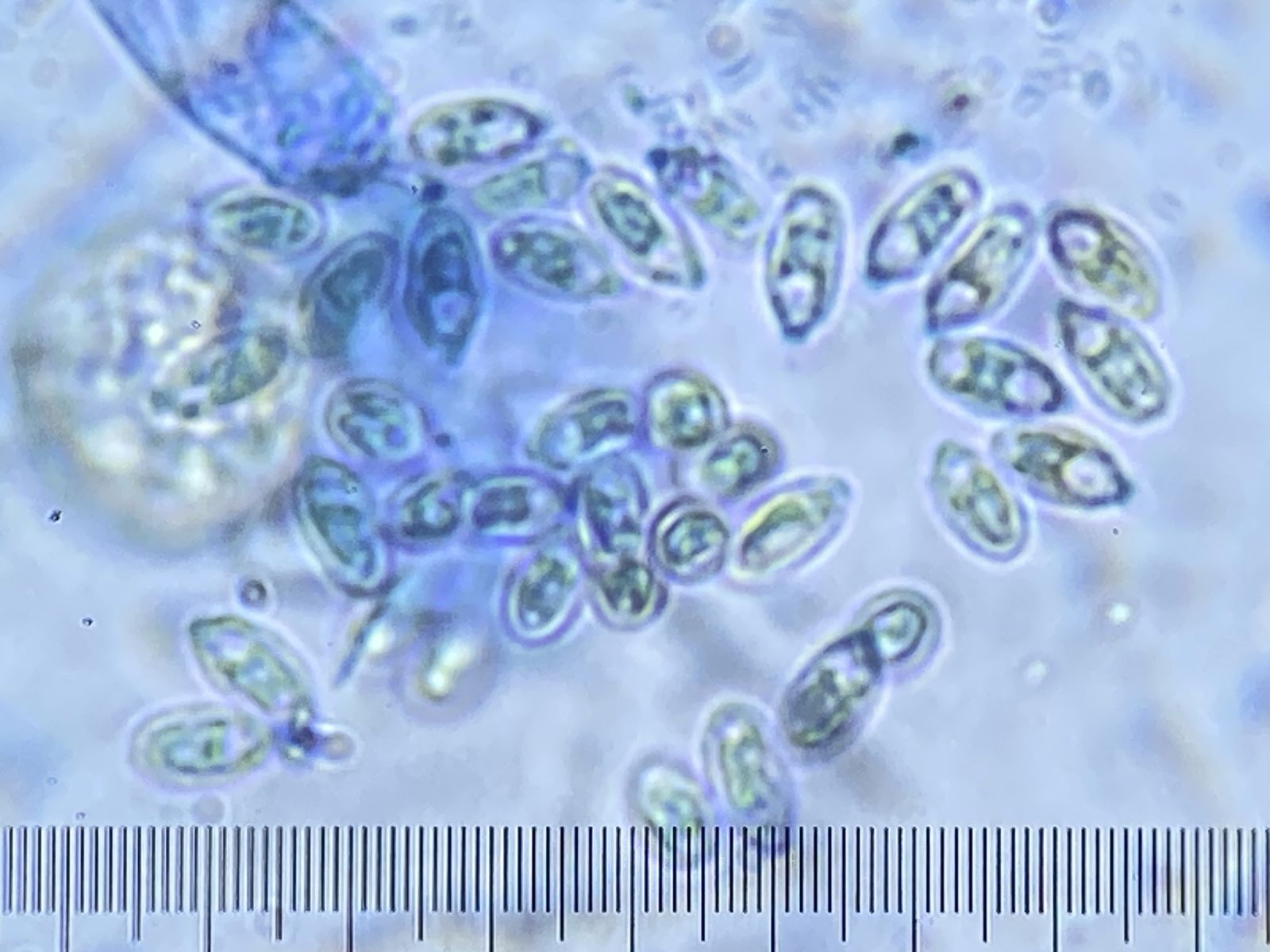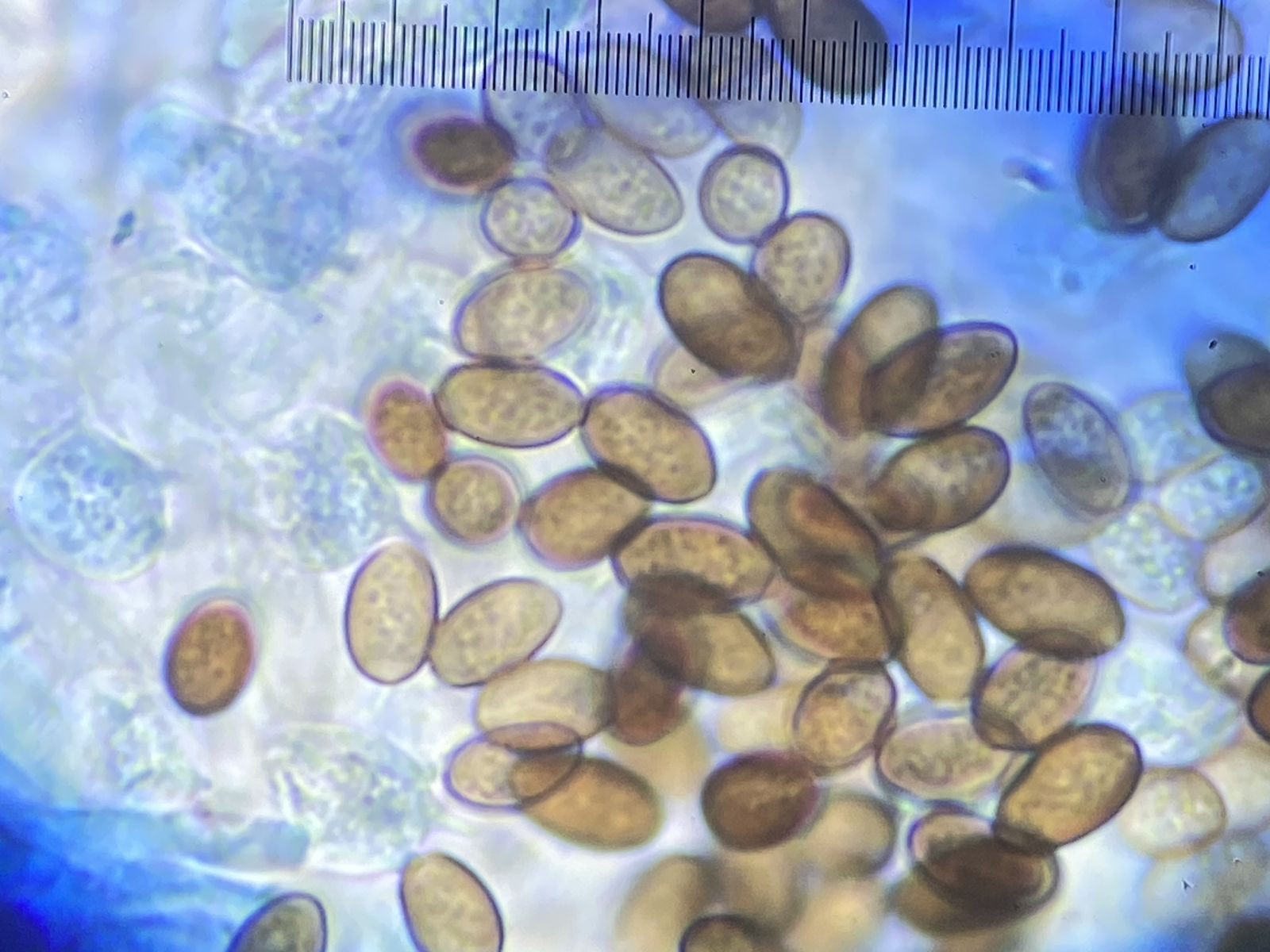 A) Sporen braun ca. 8-10 x 5-6 µm