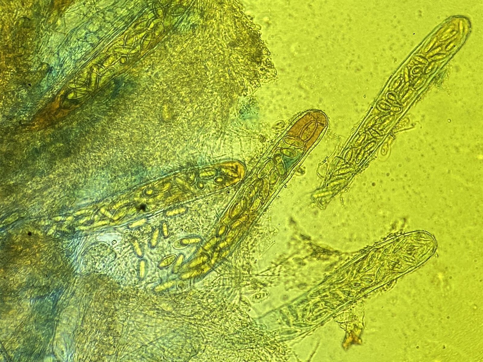 B) Ascoma weiß; ca. 32 Sporen pro Ascus, Asci ca. 290 x 80; J- evtl. dextrinoid an Spitze, Sporen ca. 20-27 x 11-13 µm,