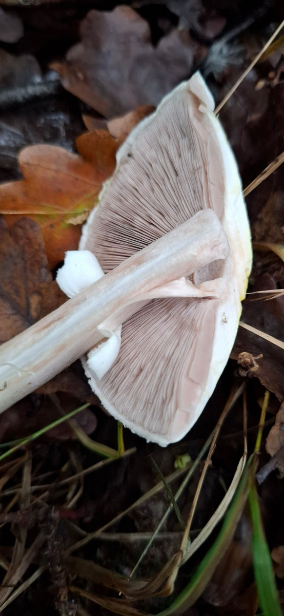 Aufgrund der Lamellenfarbe bin ich bei einem Champignon. Bin ich da richtig? Welcher könnte es sein? Und jetzt verstehe ich auch, wieso Amanita phalloides öfters mal mit Champignons verwechselt wird. Bis zum Rausnehmen war ich sicher, einen Amanita vor mir zu haben.