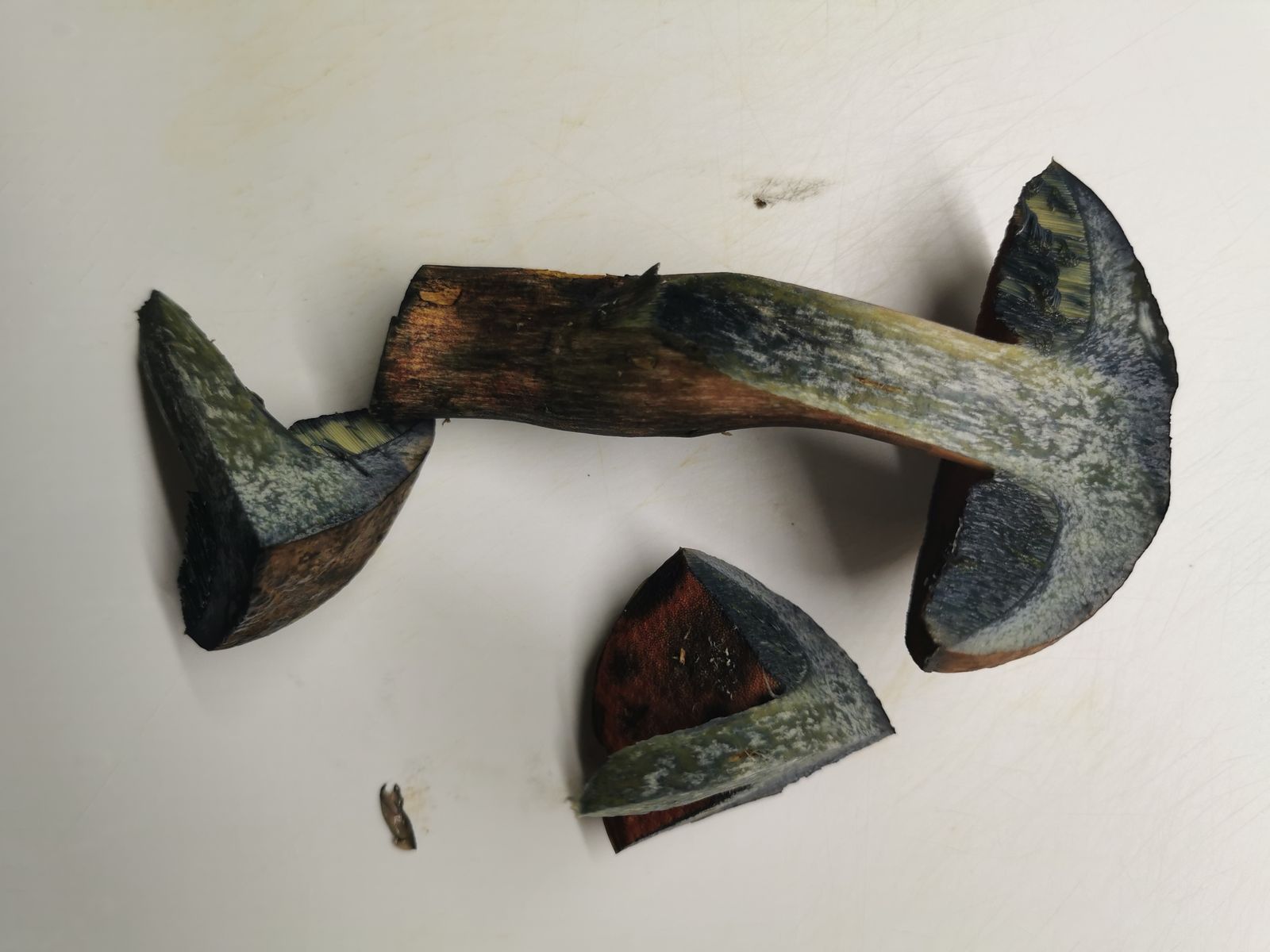 Sofort stark dunkel blauend im Anschnitt und auch dort, wo er angefasst wurde.