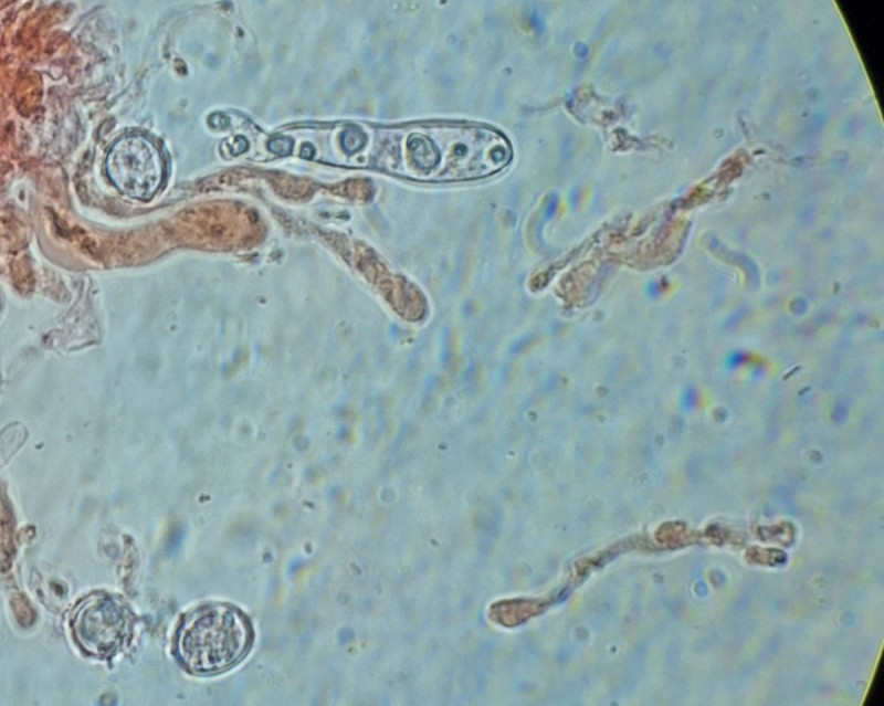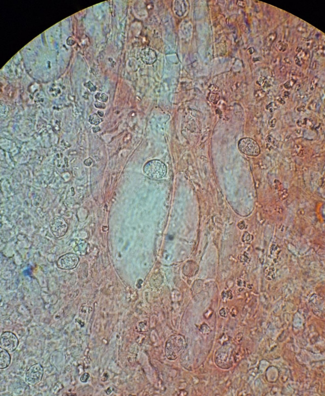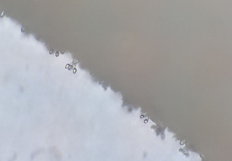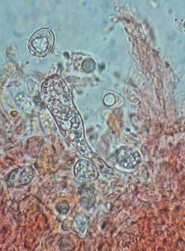 Sporen groß 8-10 (13)*5,5-7 (9) µm, variabel, Stacheln bis über 3 µm, meistens aber so um 1,5 µm, Stacheln auch einzeln in der Brühe schwimmend; Basidien/Basidiolen gibt es in variabler Länge, oft unten gegabelt