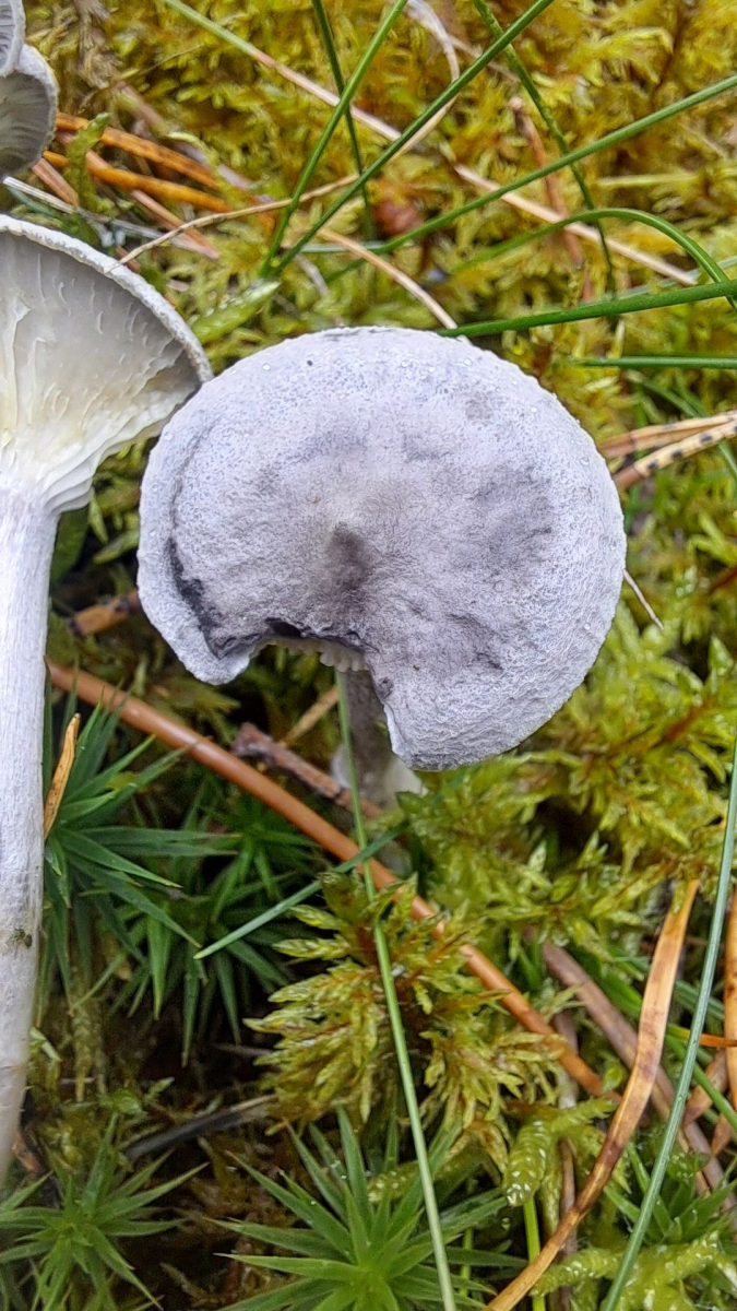Hut: grau, blau, lila, Huthaut filzig mit kleiner Erhebung ( Papille) in der Hutmitte, Hutrand eingerollt.