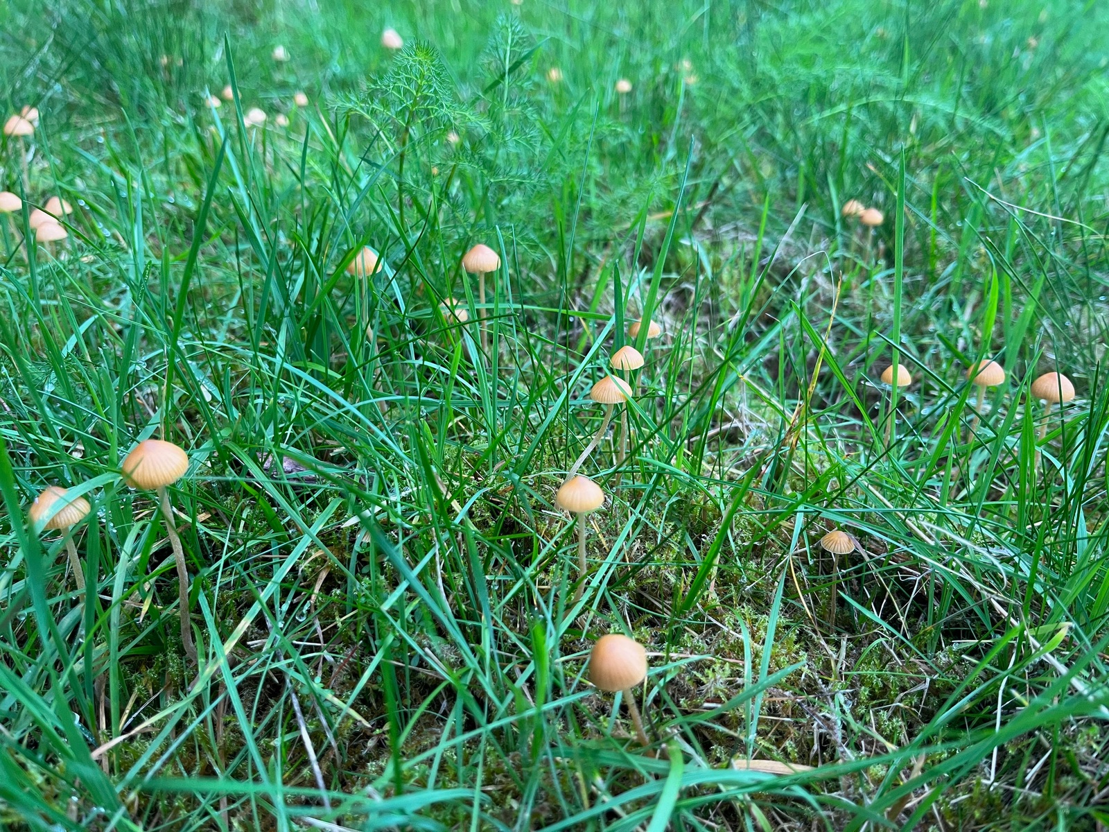 1. Ein untrügliches Zeichen, dass es sich lohnt nach Saftlingen Ausschau zu halten, sind plötzlich aufploppende größere Bestände von Galerina pumila, einem kleinen Häubling auf Magerwiesen. Die KI meint übrigens, das sei ein Häuptling