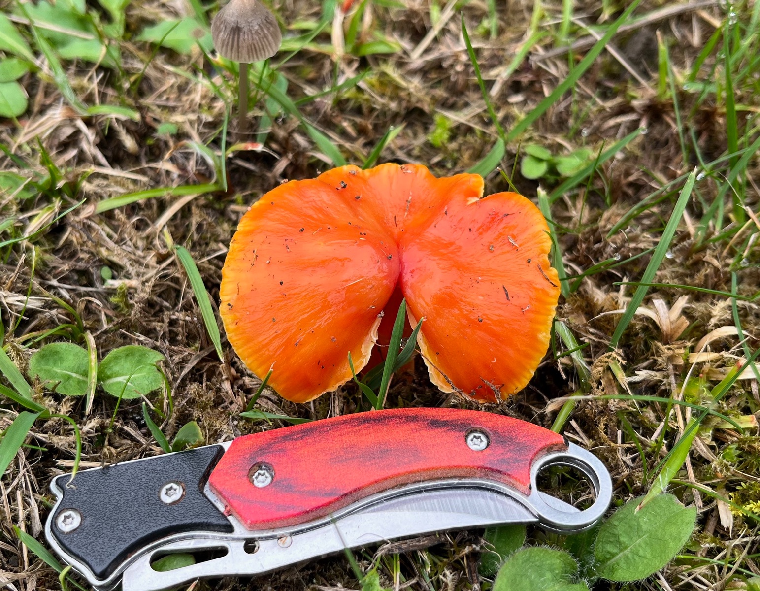 13. Die große Hygrocybe aurantiosplendens - Glänzender Orangesaftling im Vergleich zum Messer und einem Helmling im Hintergrund. Leider haben die Pilze auf meiner Wunderwiese aufgrund der späten Mahd i September alle irgendwelche Schäden.