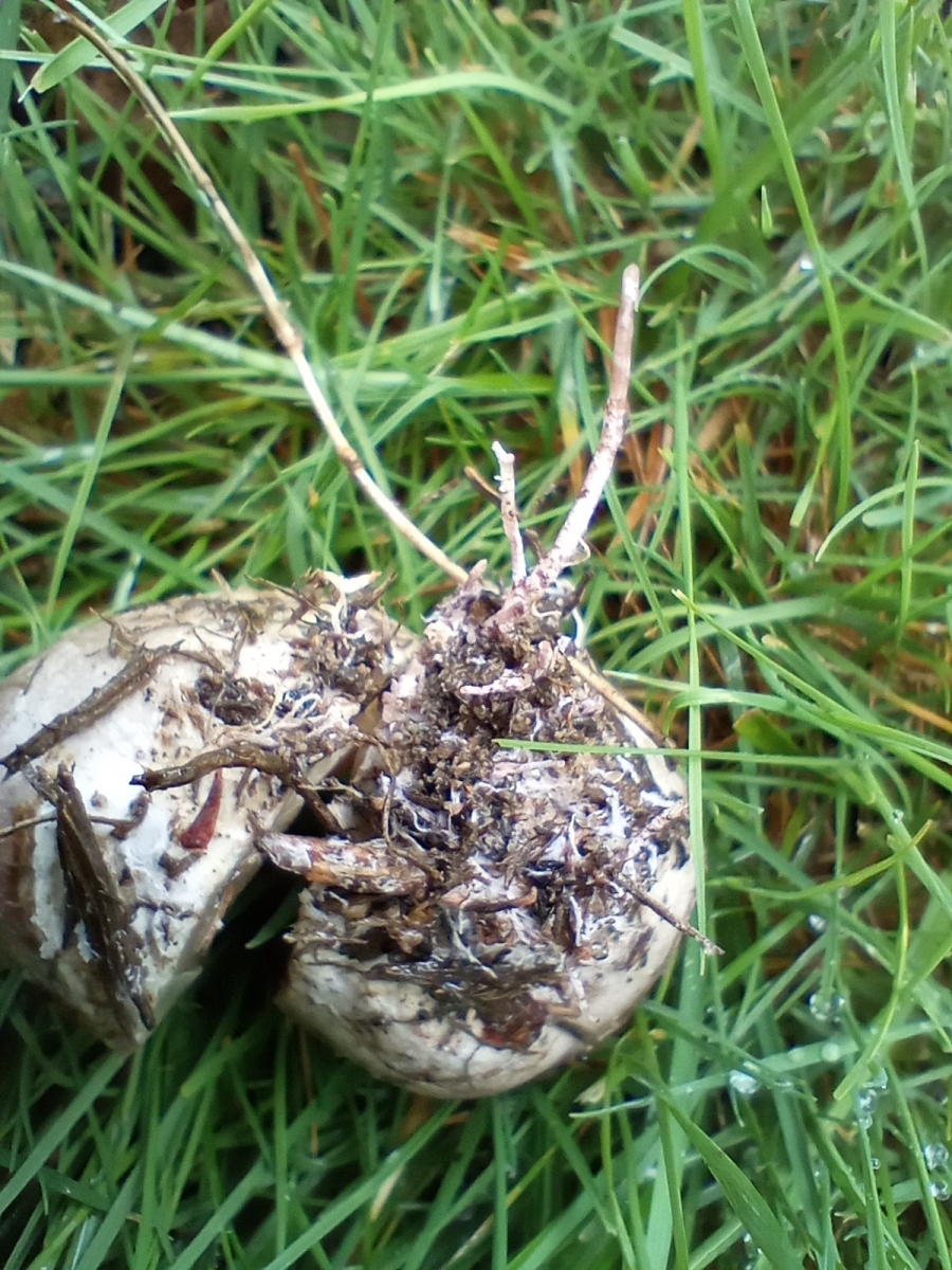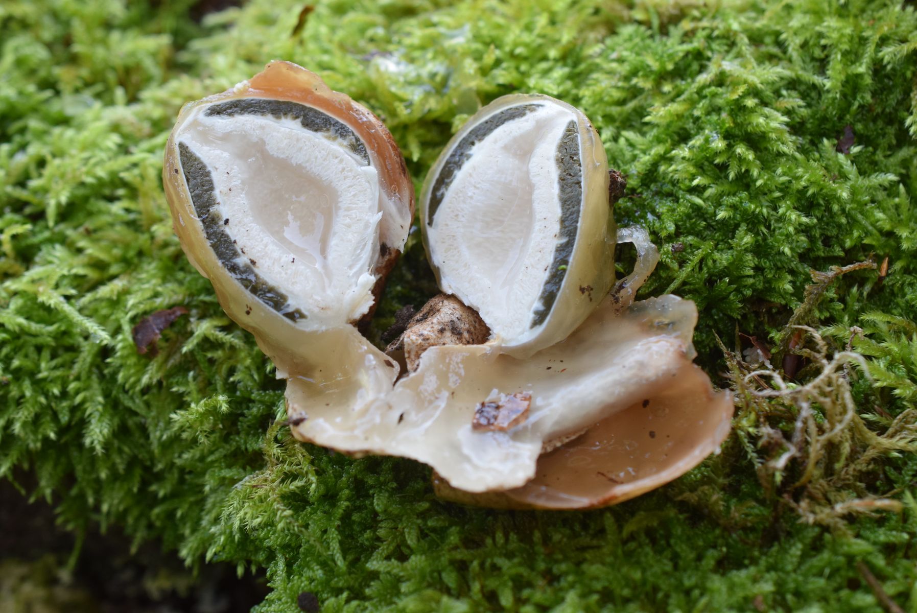 das scheint mir aber kein verlässliches, konstantes Merkmal zu sein. Ich habe ein ganzes Cluster von Hexeneiern gefunden mit weißem Mycel. Heute zeigt sich im Schnitt, dass esv sich definitiv um Clathrus archeri handelt: