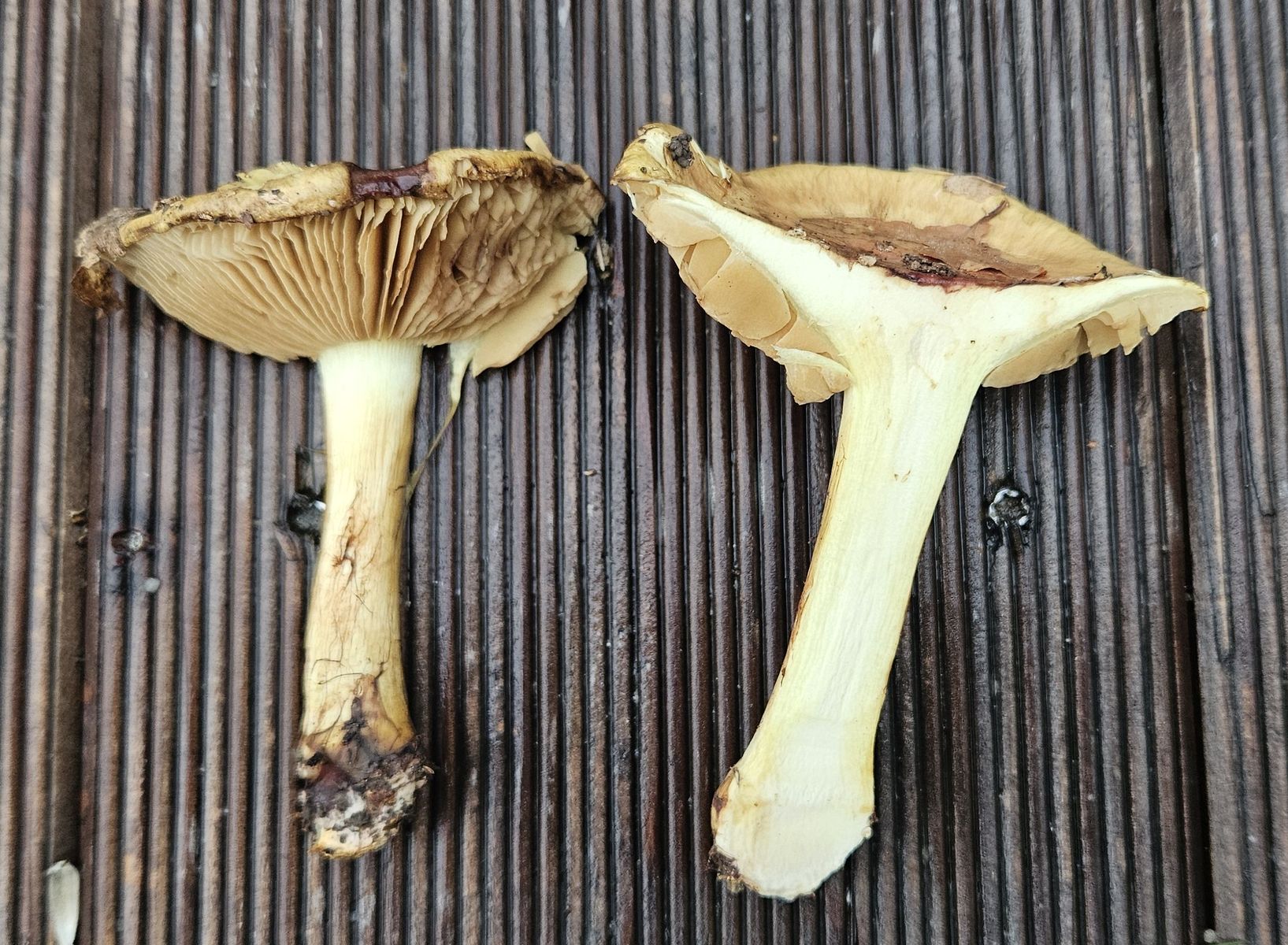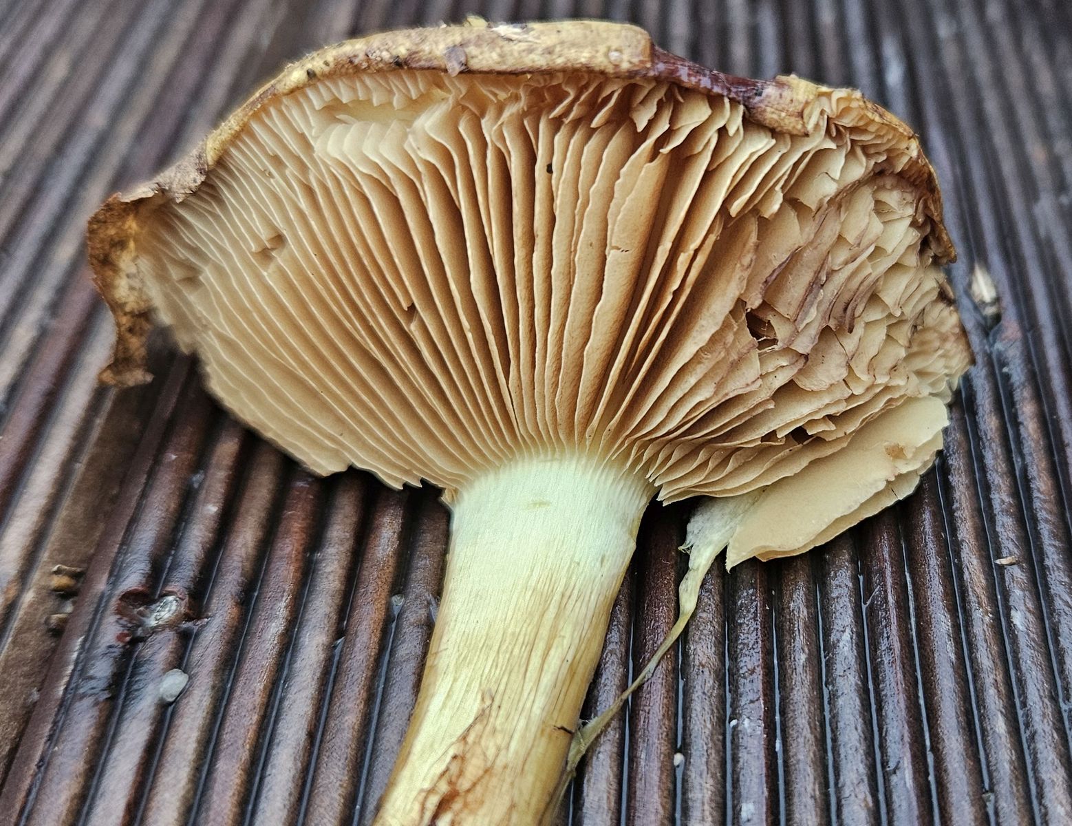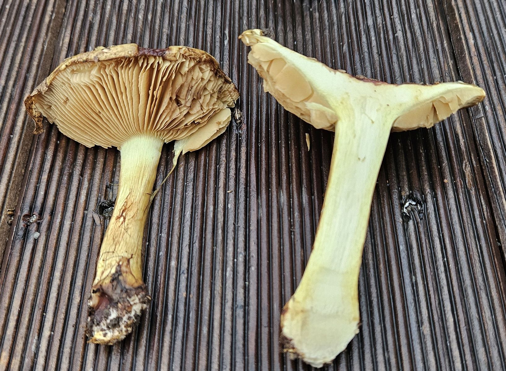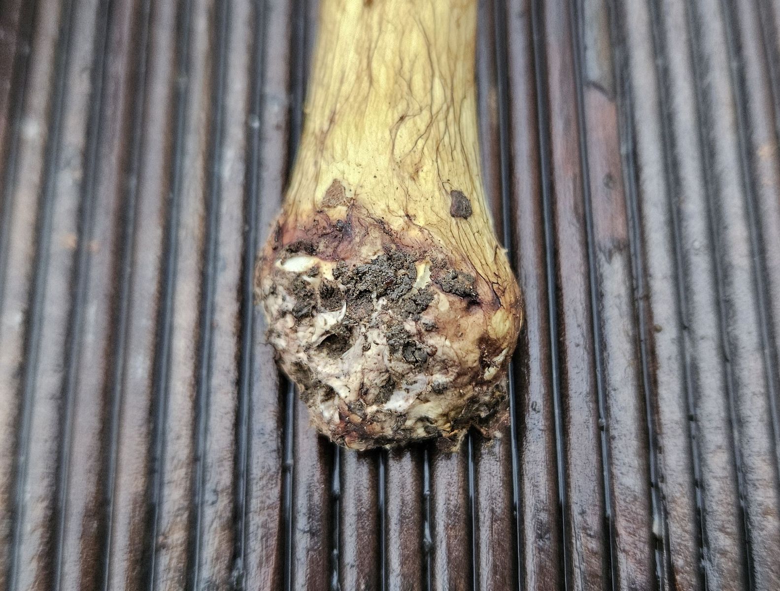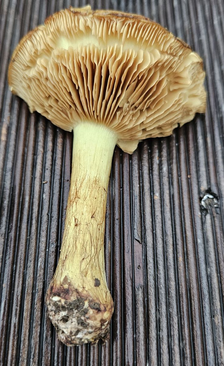 Fundort war ein wärmebegünstiger, trockener Südhang auf Muschelkalk unter Eichen/Buchen (Schönberg, südlich von Jena). Der ganze Fruchkörper ist gelblich gefärbt mit ganz leicht grüner Nuance, Hutmitte dunkler und bräunlich). Die Lamellen sieht man auch noch im Alter an, dass sie mal gelblich waren. Die Knolle ist rundlich und nur schwach ausgeprägt. Das Fleisch ist hell grüngelb, im Bereich der Stielrinde auffällig dunkler (grünlicher) gefärbt. Geruch ist eher unauffällig, leicht malzig (wobei die Gerüche bei älteren Exemplaren, die schon eine Nacht in Alufolie gewickelt herumlagen, eher mit Vorsicht zu genießen sind).