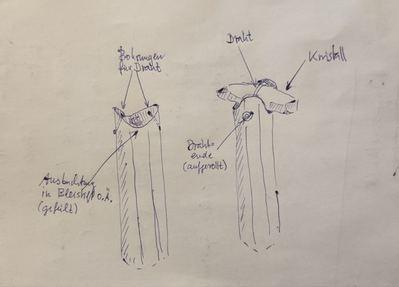 der Kristall, den ich gekauft habe, ist dafür einfach zu klein. Bei deinem Verfahren würde nur ein Spitzchen herausragen. Ich möchte lieber mit einer Fläche über den Täublingsstiel reiben.