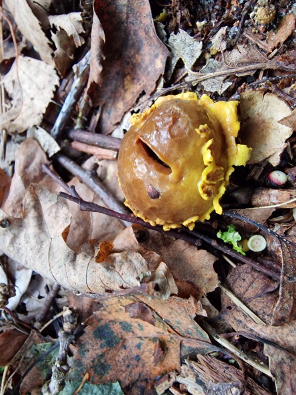 Heute im Mischwald (sehr viele verschiedene Bäume, Nadel und Laub) fand ich dieses Ding und kann es leider nicht identifizieren.. Die Oberfläche ist etwas breiig/schleimig. Es gab leider nur ein einziges Exemplar, daher hab ichs so belassen. Vielleicht hat ja trotzdem jemand eine Idee.