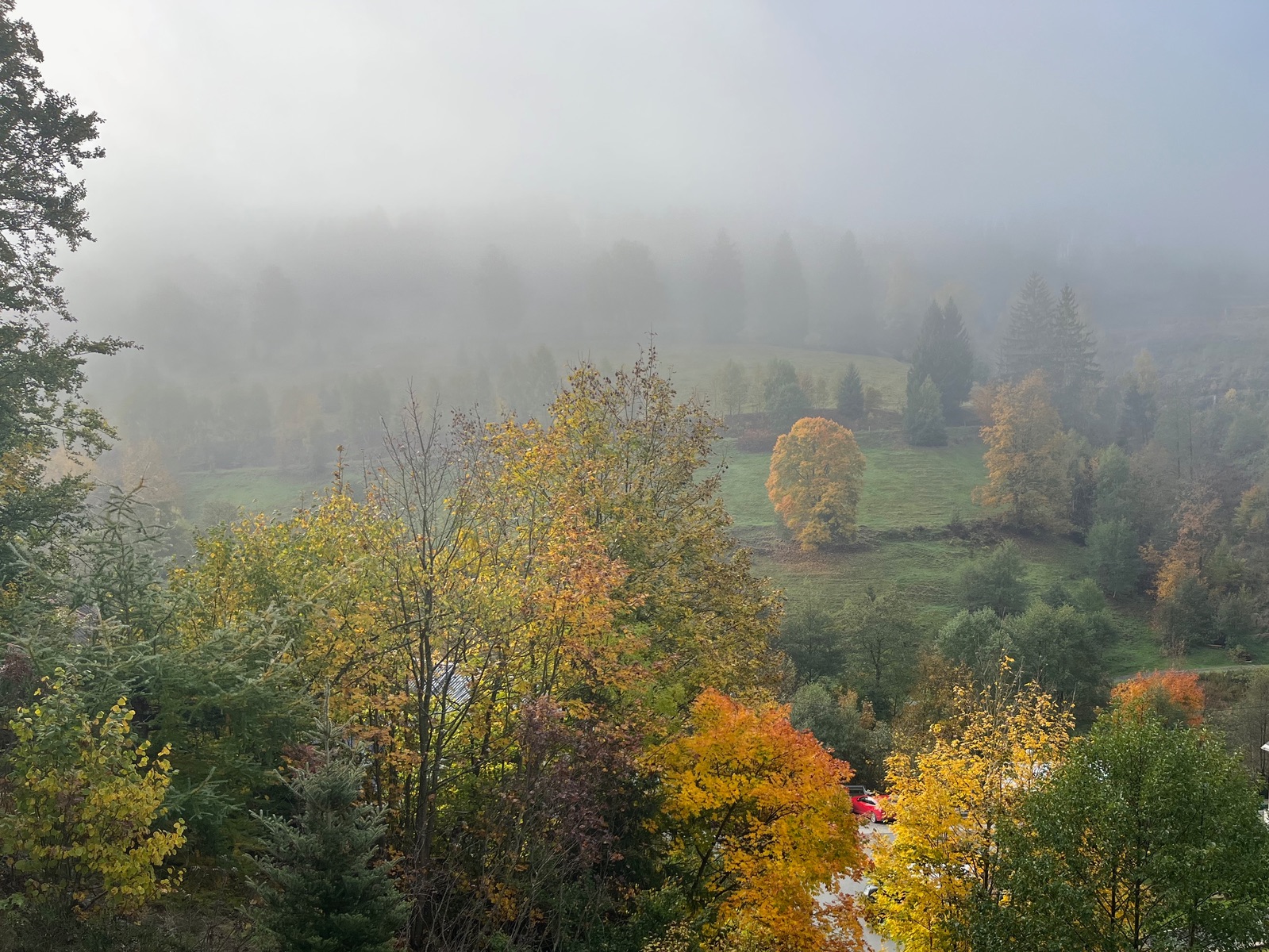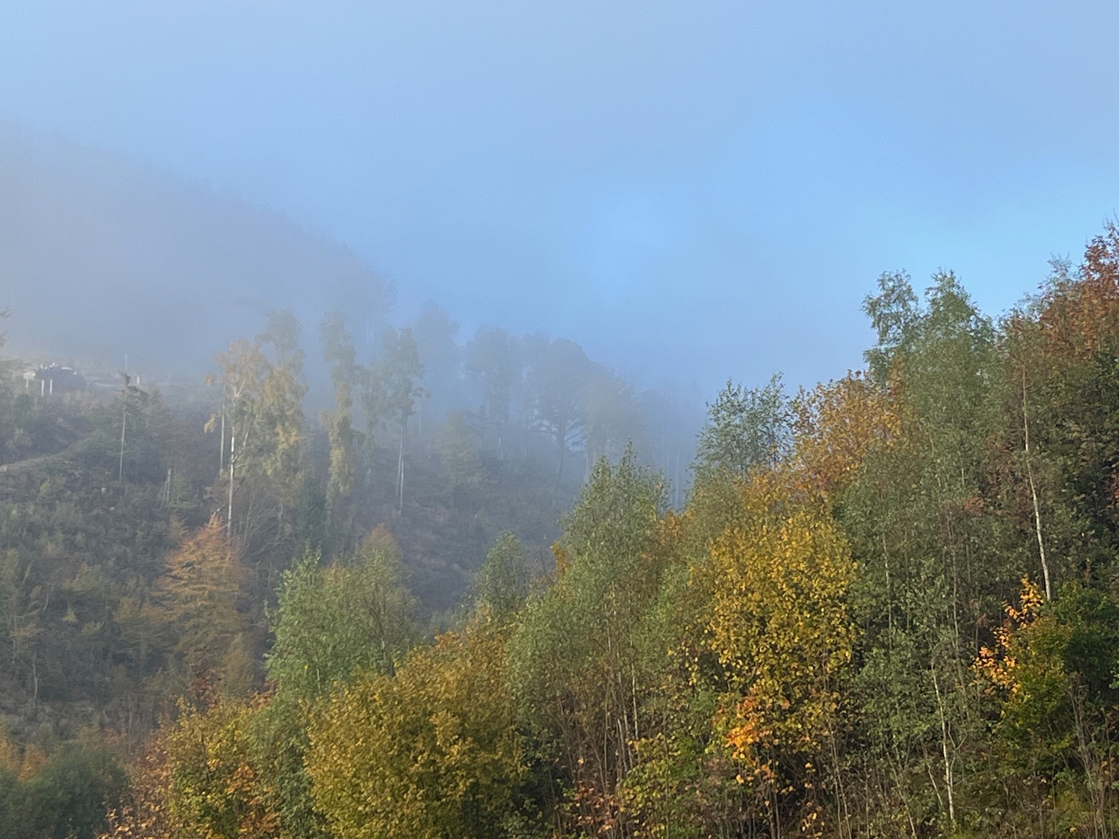 jetzt ist Wiesenpilzzeit, also Zeit, die potenziellen Saftlingsstandorte zu besuchen. Nebel und buntes Herbstlaub heute früh beim Blick aus dem Fenster.