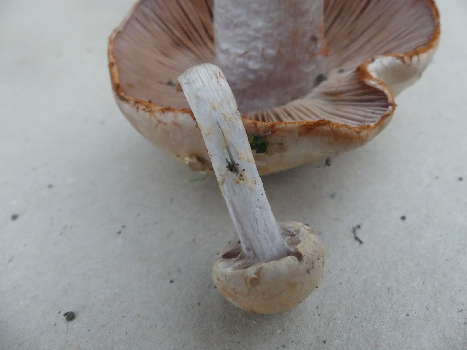 So ein schöner rostroter Cortinarest an der Hutkante. Die Stielspitze ist auch recht markant durch den blauvioletten Hauch und eine gewisse "Unebenheit", die man aber fotografisch kaum festmachen kann. Je nach Lichtverhältnissen wirkt das richtig strukturiert.