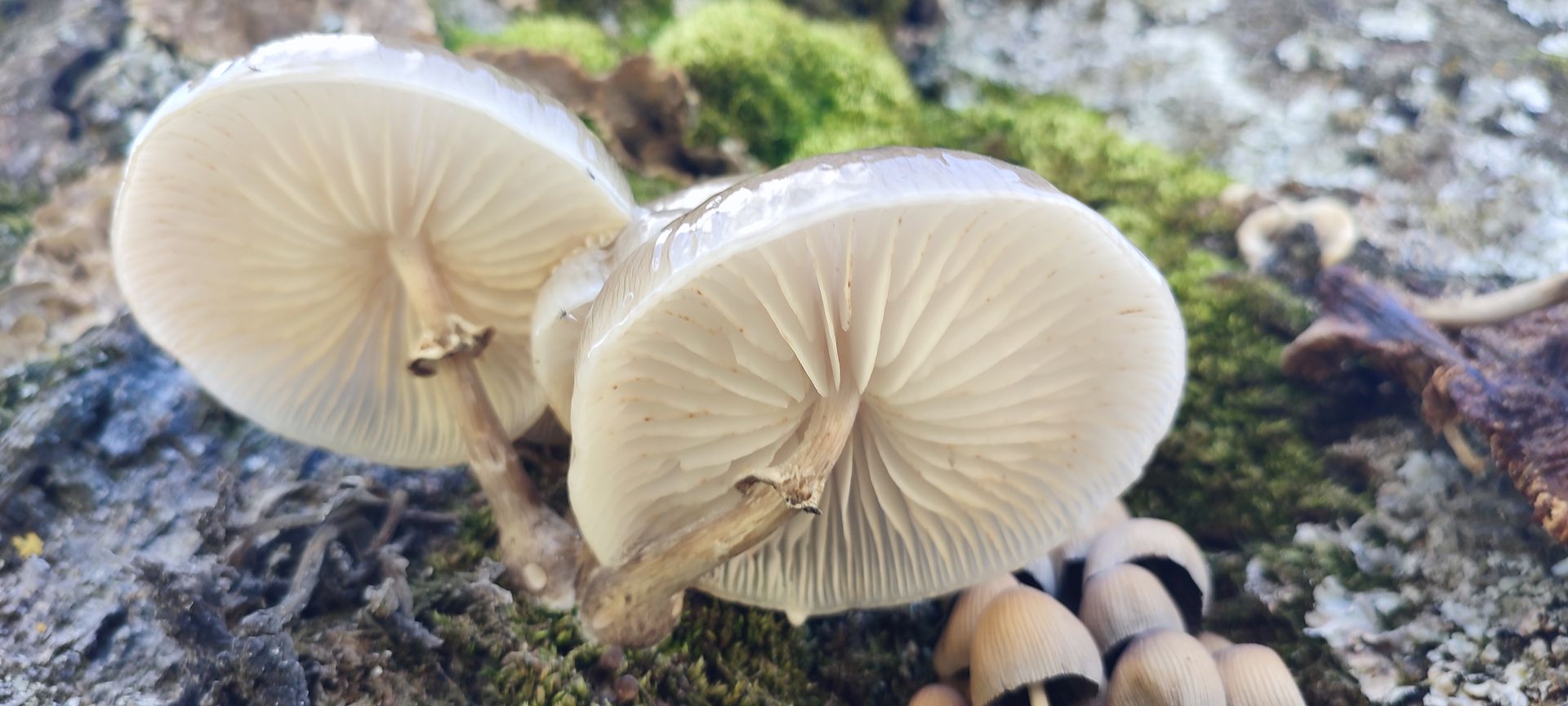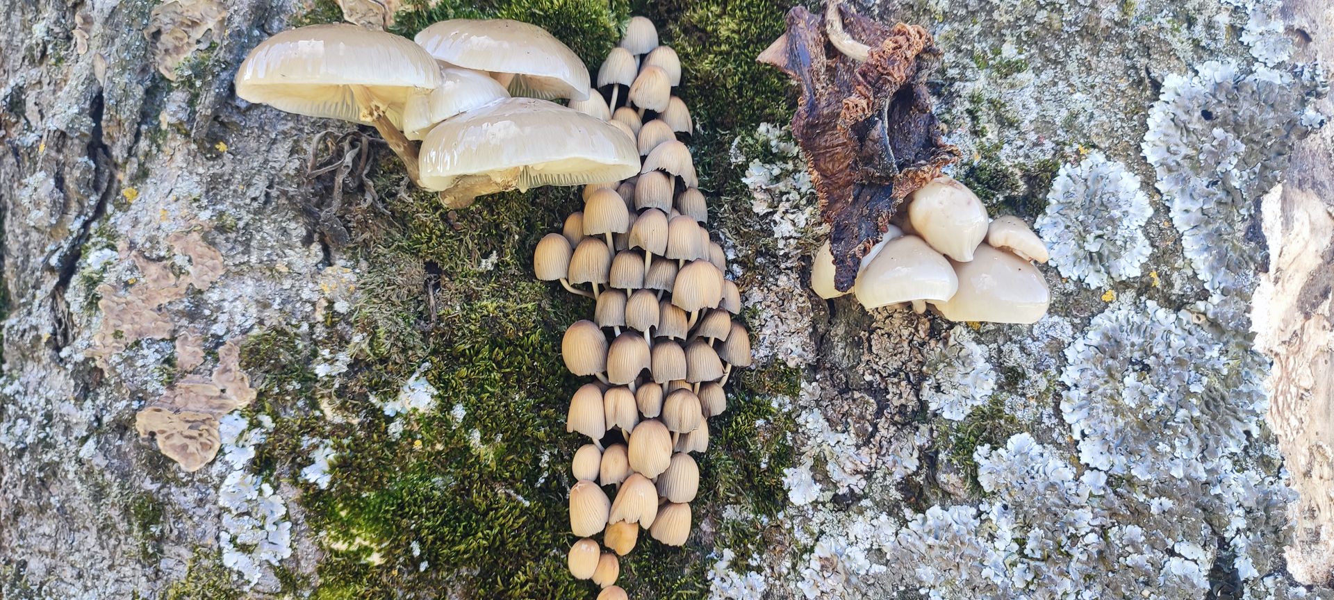 Dann am Stamm einer mächtigen vor ca 10 Jahre vom Sturm gestreckten Buche Tintlinge und etwas Glitschiges: