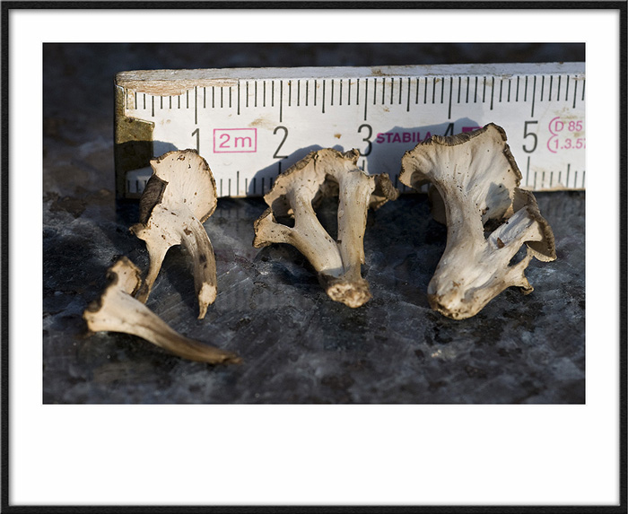 Für den Eichasen fehlte der doch sehr starke aromatische Duft, der Pilz wuchs nicht auf Holz (hab dies jedenfalls nicht erkannt) und die zwei Eichhasen die ich bislang fand wuchsen viel bücheliger zusammen, hier waren es nur einzelne Pilze die einige cm von einander standen. Wir wohl ein Rätsel bleiben, die Pilze liegen im Müll, Mikroskop hab ich nicht und nach Sporen suchen, ich glaub nicht dass das viel gebracht hätte, keine Lamellen und keine Röhren vorhanden, geht das bei Leistlingen überhaupt ? Aber ich gehe spätestens nächste Woche noch mal an diese Stelle um die Totentrompeten zu "ernten", es waren auch eine Reihe sehr kleiner Trompetenpfifferlinge dort, mal kucken ob die gewachsen sind und dann schau ich mir das nochmal an, villeicht finde ich noch ein paar solche Exemplare. (PS, nur nebenbeibemerkt, es ist ein recht steiler Hang und ich hab mir vor 3 Wochen das Schlüsselbein gebrochen, mir einer Hand geht schlecht um dort auch noch Fotos zu machen!!)