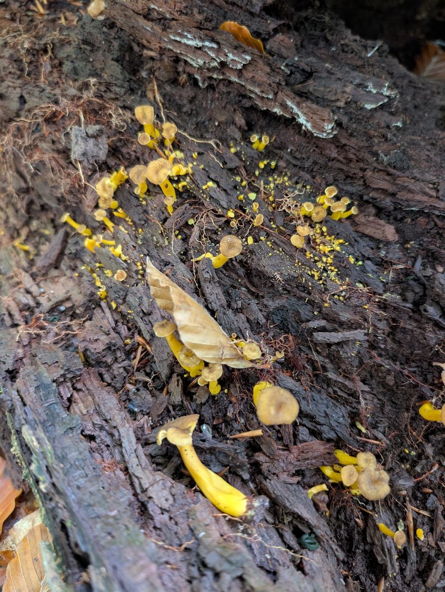• Ich sehe da auch ordinäre Trompetenpfifferlinge. Ich habe schon öfter gehört, dass sie manchmal vermeintlich aus Totholz herauswachsen. Vermutlich mag das Myzel einfach die Feuchtigkeit dort. Würde man den Holzstamm zerkleinern, könnte man wahrscheinlich sehen, dass das Myzel aus dem Boden in den Stamm reinwächst.