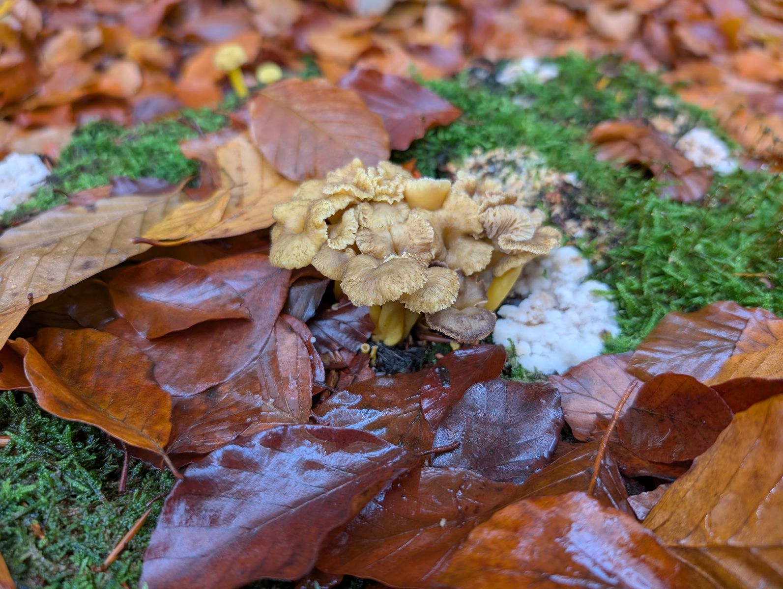 Ringsum war ein relativ saurer Boden mit vielen Buchen….. Und weil die Trompetenpfifferlinge ja tendenziell eher mit Nadelholz in Verbindung stehen.