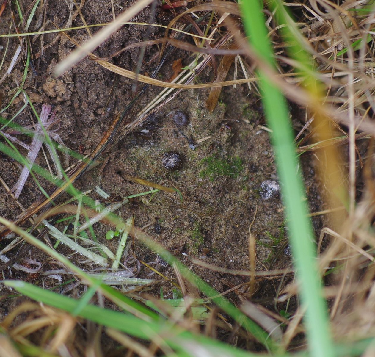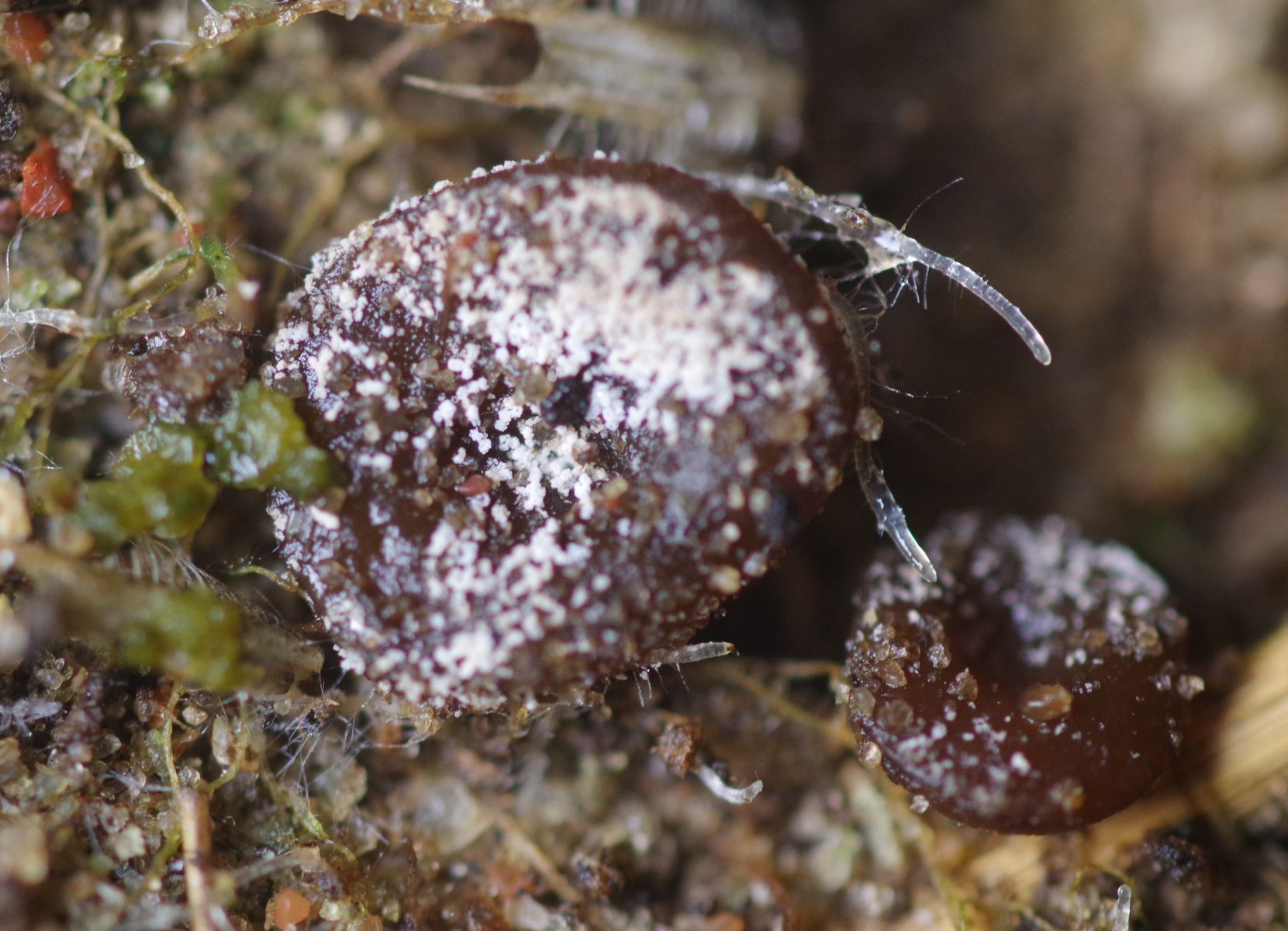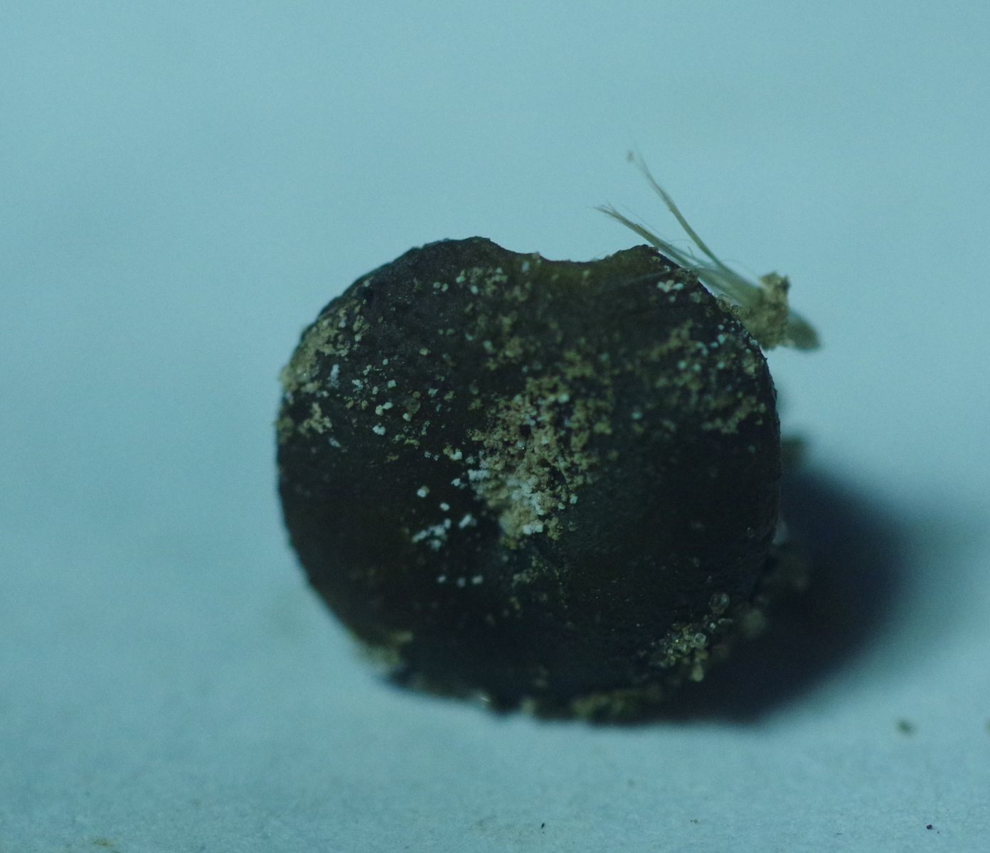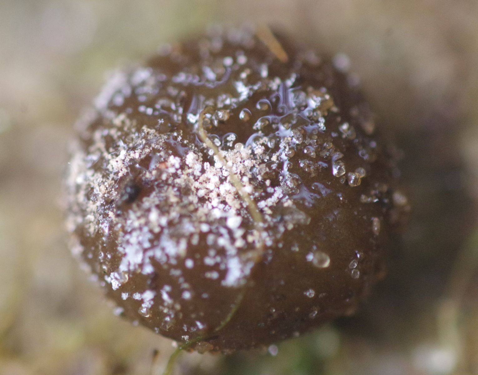 Ein brauner, relativ dicker Becher, etwa 5 mm im Durchmesser und ebenso hoch, auf Sand mit weißlichen Krümeln obendrauf. Alle Exemplare hatten diese Krümel. Vor Ort hatte ich keinen Fotoapparat dabei also nur ein Kunstlichtfoto.