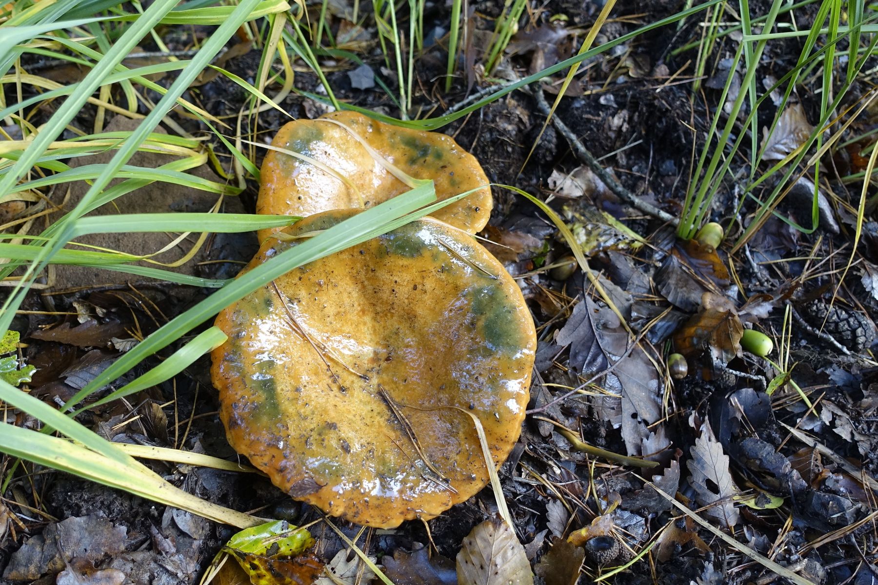 Bild 1: Gefragter Pilz von oben - Hut gelblich mit grün-blauen Flächen