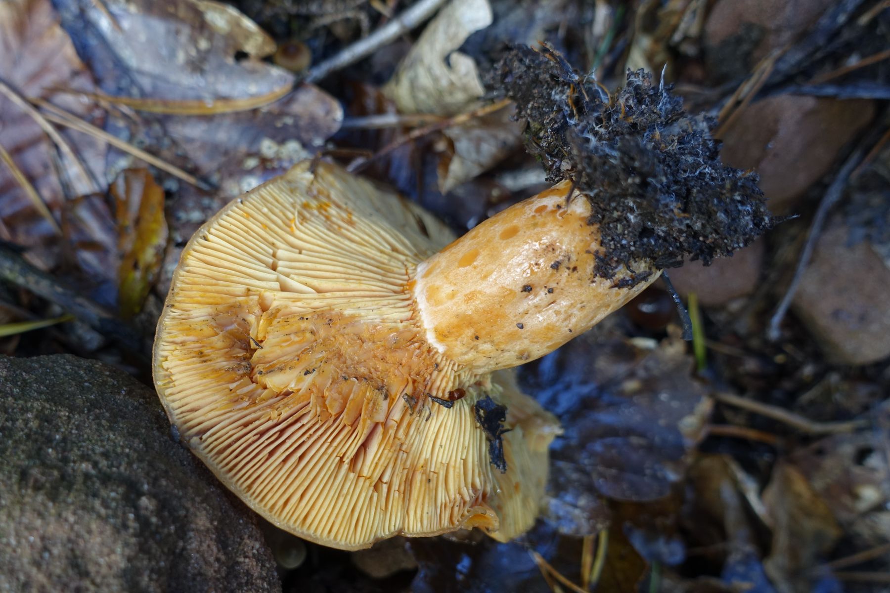 Die Lamellen scheinen recht spröde zu sein und ich meine, gelbliche Milch zu erkennen.Der Stiel weist dunklere Flecken oder Gruben auf.