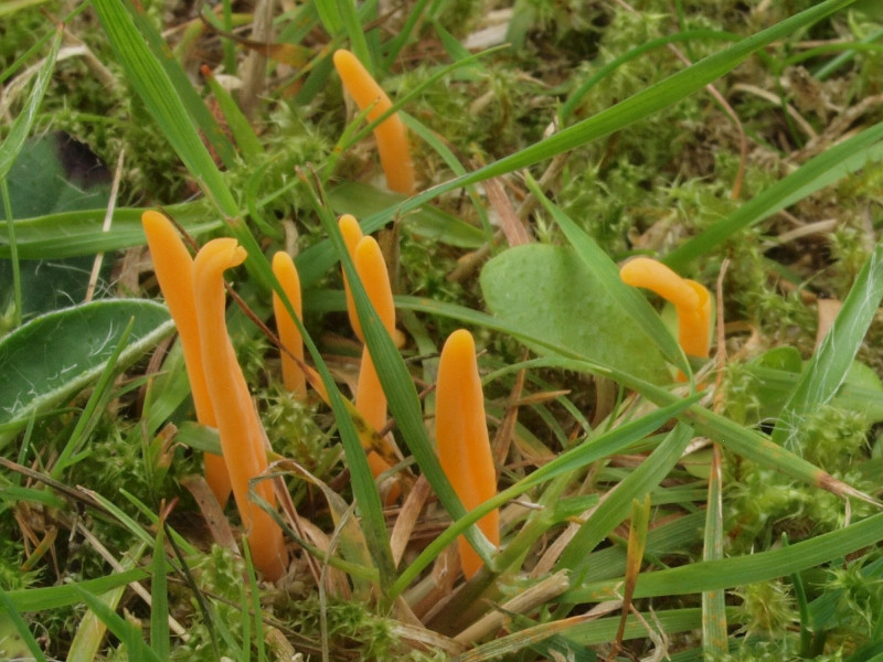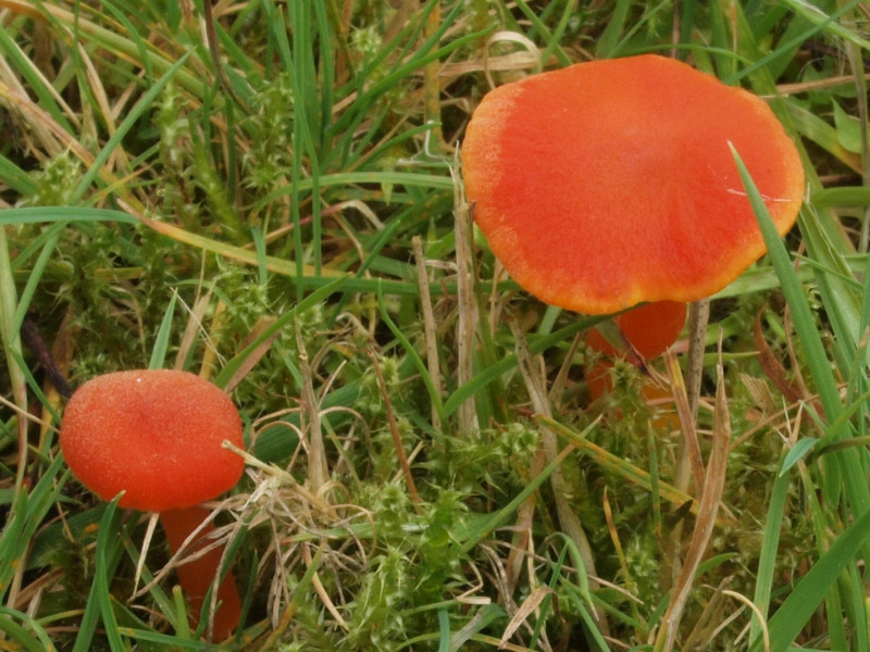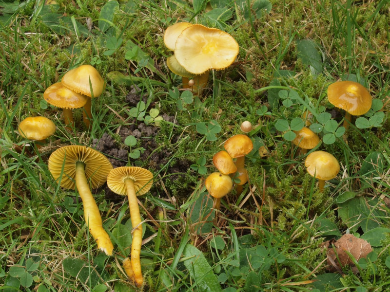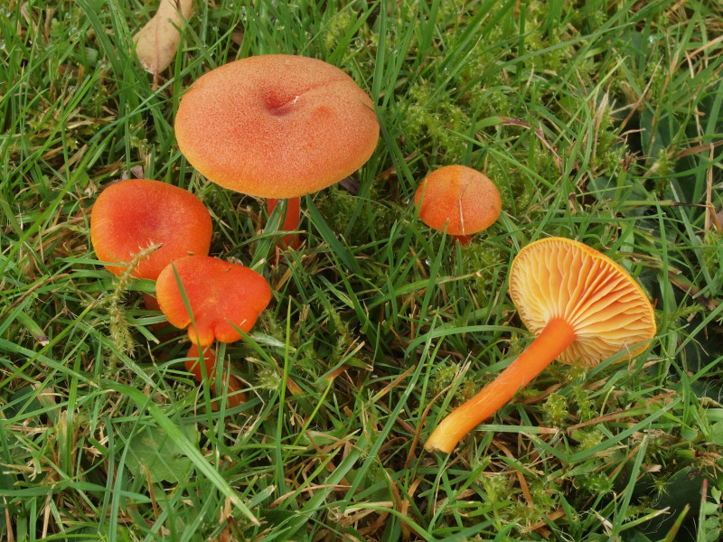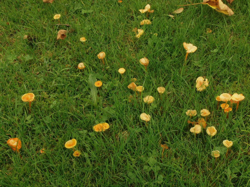 Nicht zu übersehen waren zahlreiche Exemplare des Orangefarbenen Wiesen-Ellerling (Cuphophyllus pratensis)