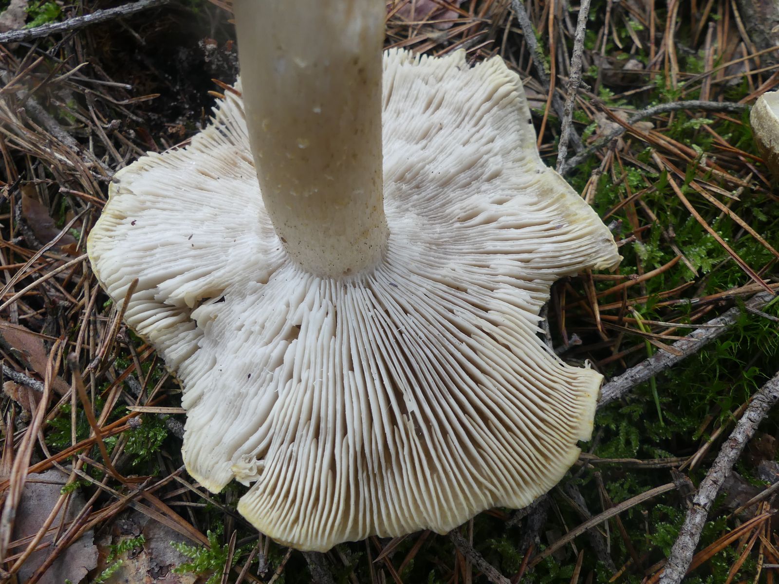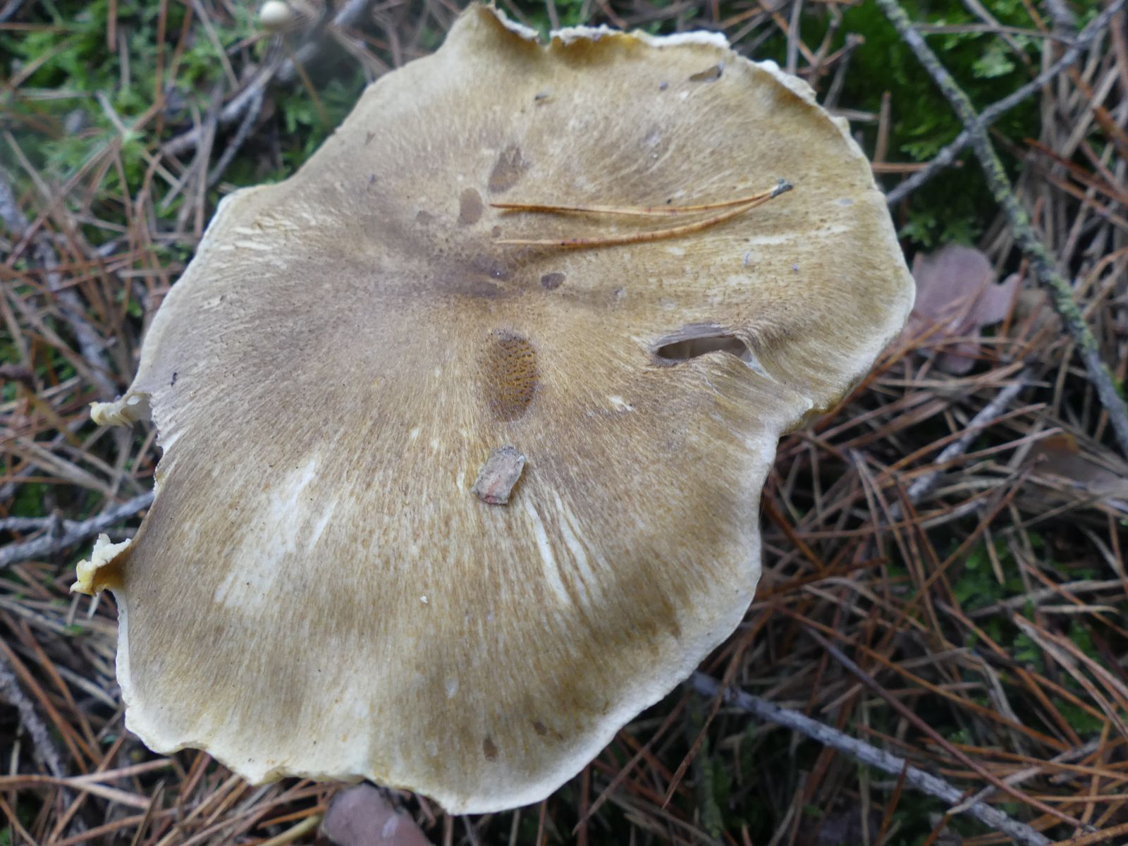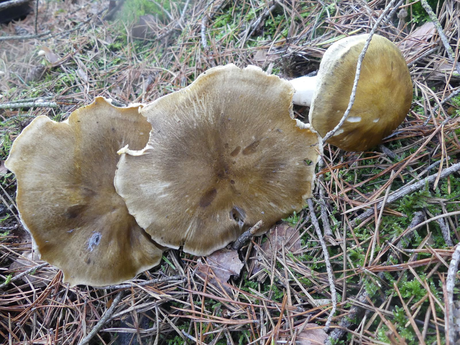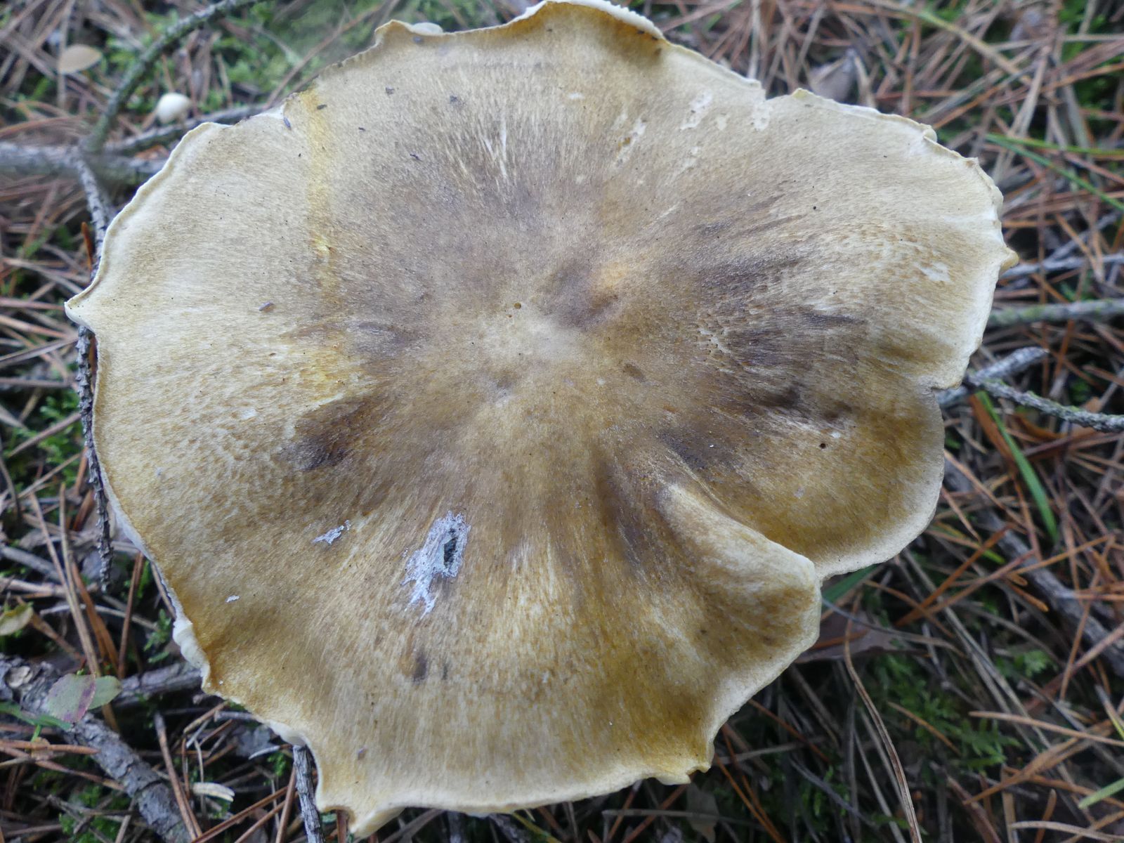Gefunden habe ich die Exemplare im reinen Kiefernwald auf sehr sandigem Boden. Zunächst dachte ich von oben betrachtet an T. sejunctum, dann an T. saponaceum. Nachdem ich einen Fruchtkörper entnommen und umgedreht hatte, ist der Groschen gefallen. Der gelbliche Rand auf der Hutunterseite verrät die Art, allerdings verblasst das mit zunehmender Fruchtkörperreife und die Lamellen werden bei vollreifen Fruchtkörpern graustichig.