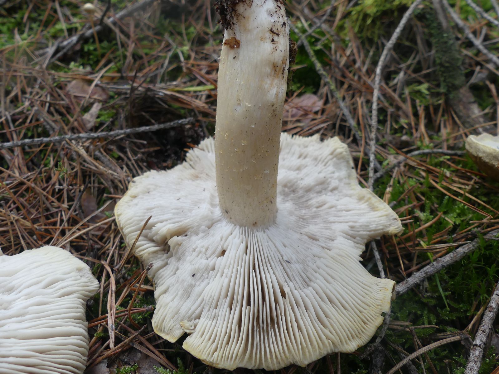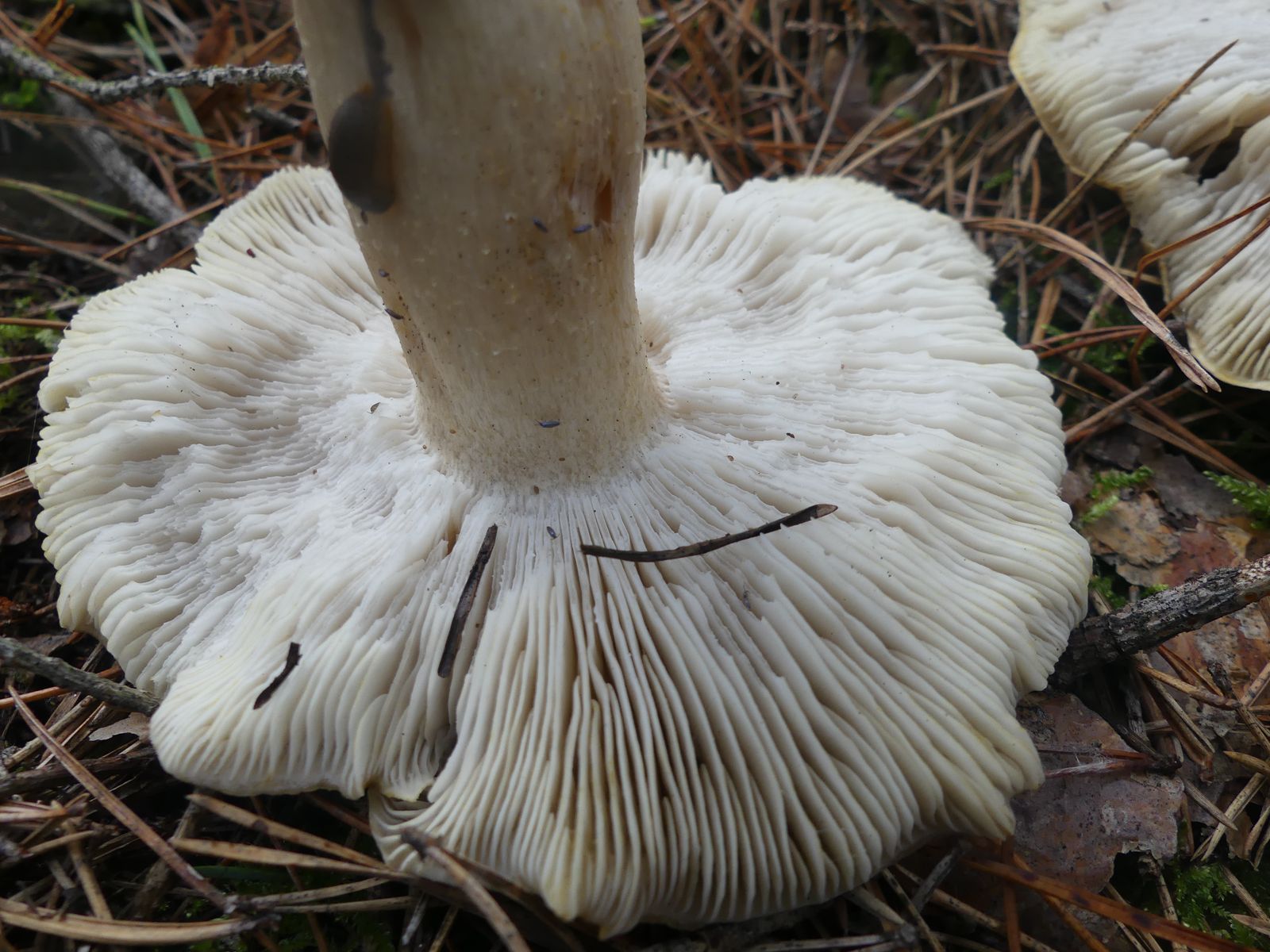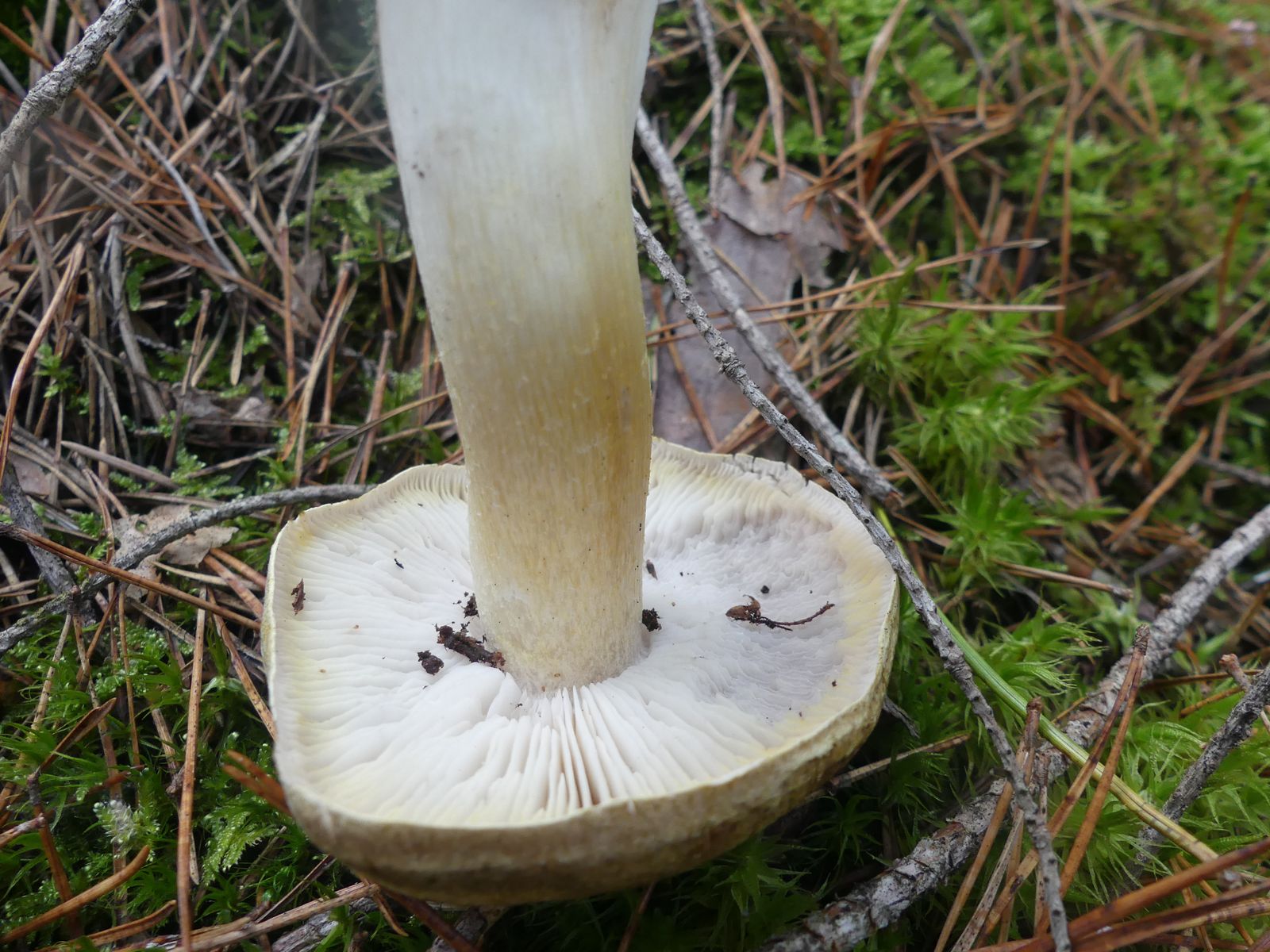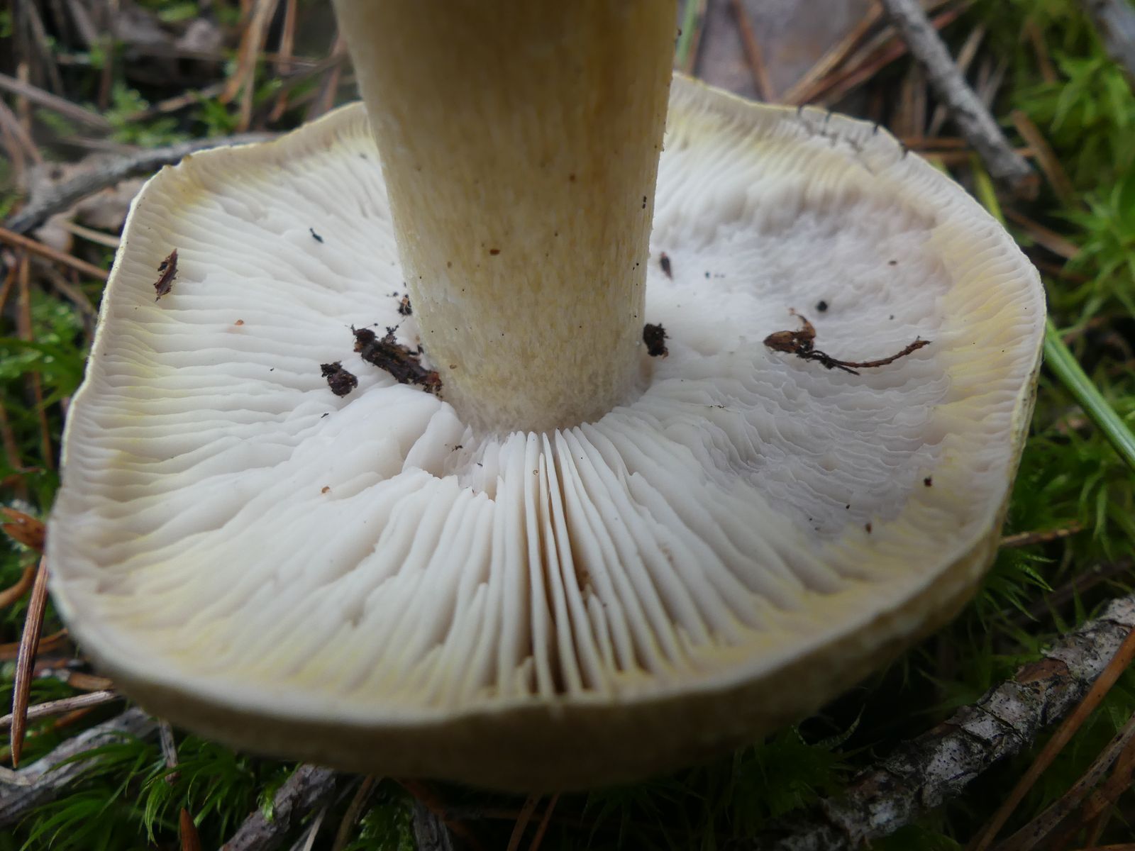 Gefunden habe ich die Exemplare im reinen Kiefernwald auf sehr sandigem Boden. Zunächst dachte ich von oben betrachtet an T. sejunctum, dann an T. saponaceum. Nachdem ich einen Fruchtkörper entnommen und umgedreht hatte, ist der Groschen gefallen. Der gelbliche Rand auf der Hutunterseite verrät die Art, allerdings verblasst das mit zunehmender Fruchtkörperreife und die Lamellen werden bei vollreifen Fruchtkörpern graustichig.