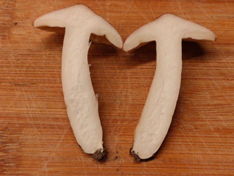 Sehr brüchig und ordentlich niedergedrückt. Der rote Reflex am Stiel reicht apikal bis zum Hut. Die Lamellen bräunen nicht mehr. Die Guajak-Reaktion ist nun zu erkennen dauert aber extrem lange.