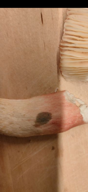 Die Lamellen bräunen bei Verletzung! Es gibt keine Reaktion auf Guajak! Der Stiel läuft basal spitz zu und ist deutlich rot überhaucht.