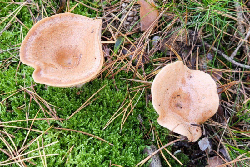 Sie standen im Moos zwischen Kiefern. Es gab in der Nähe auch eine kleine Buche und ein paar kleine Birken, aber diese Laubbäume sind ziemlich klein (3m hoch?) und dünn. Auf einem meiner Fotos sehe ich auch einen Eichensämling, ich kann mich aber nicht daran erinnern, in der Nähe der Milchlinge eine Eiche gesehen zu haben.