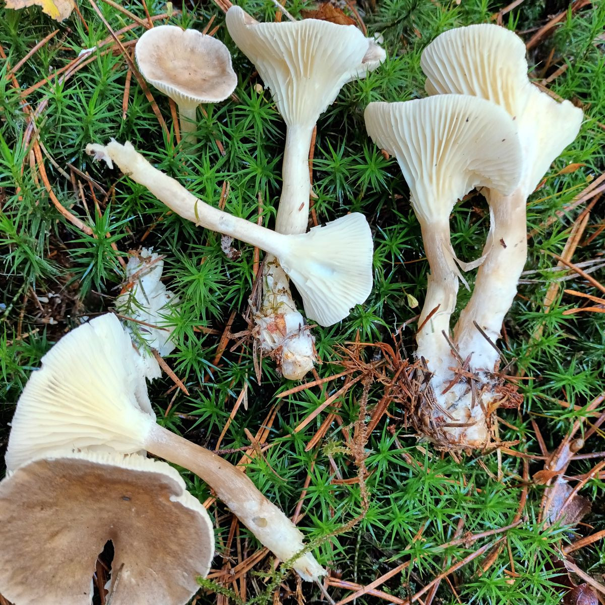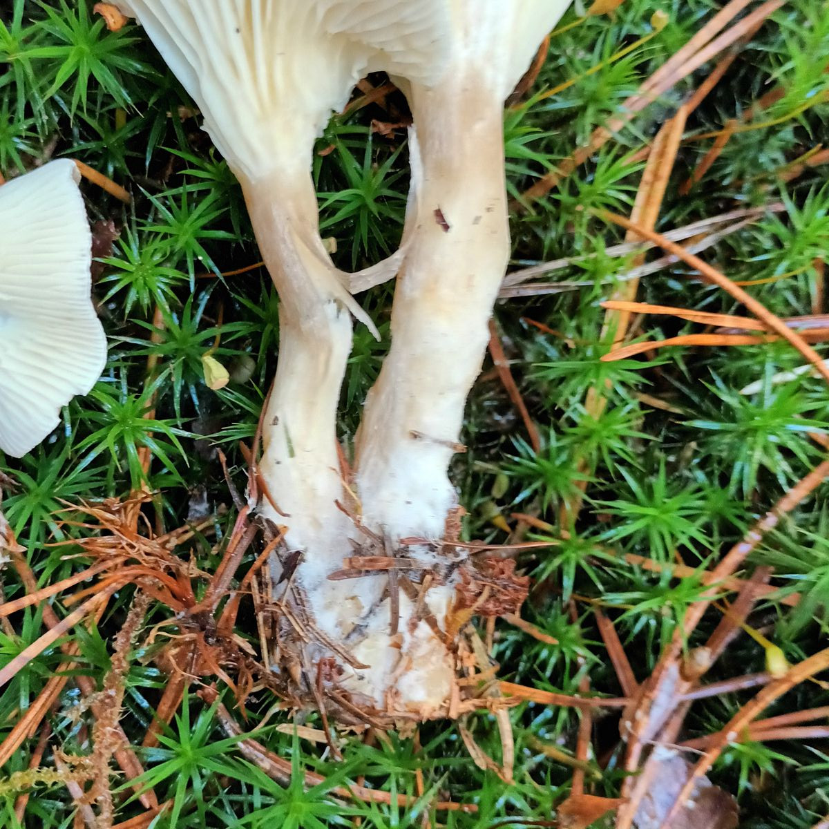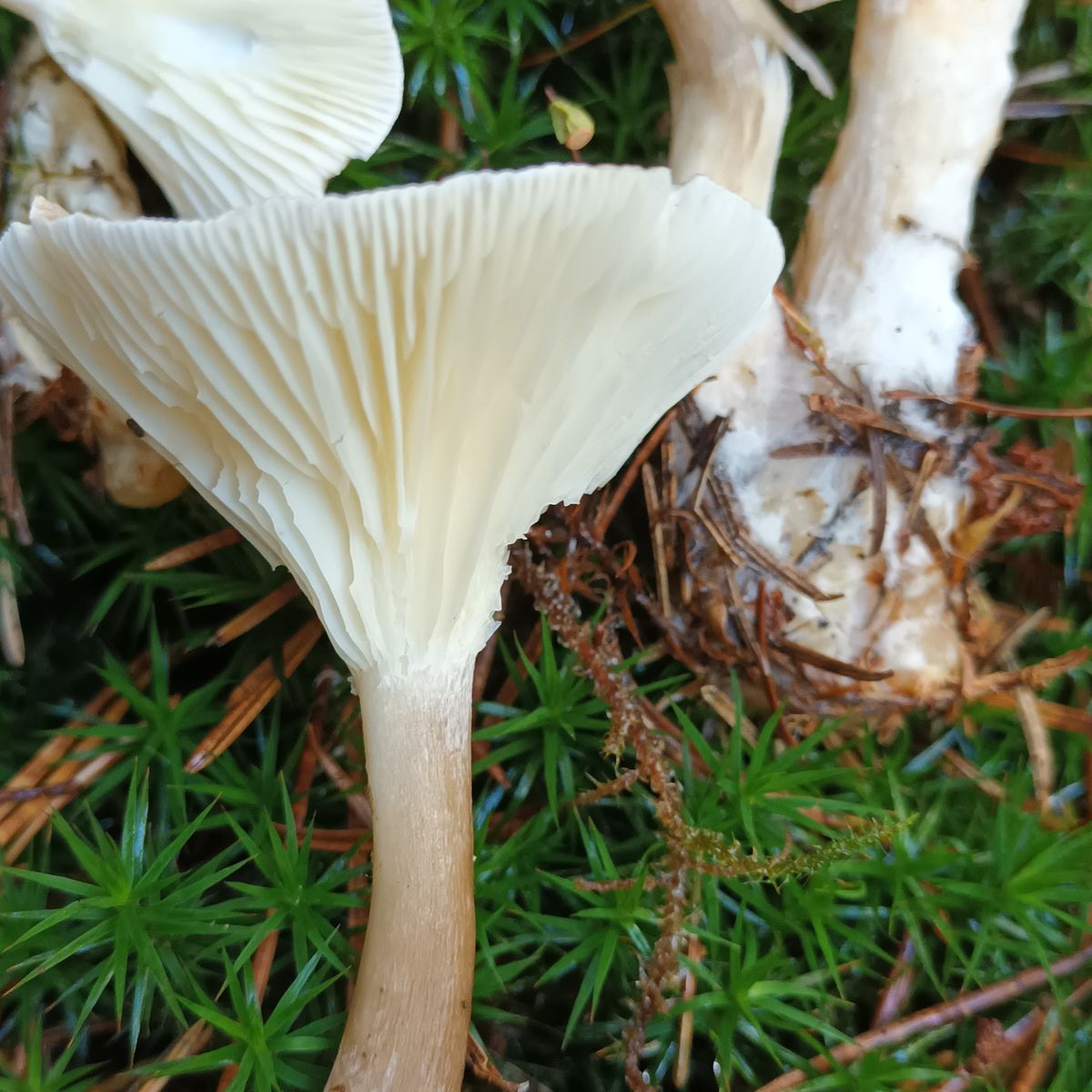 Die Lamellen laufen weit am Stiel herab. Sie sind weiß, untermischt.