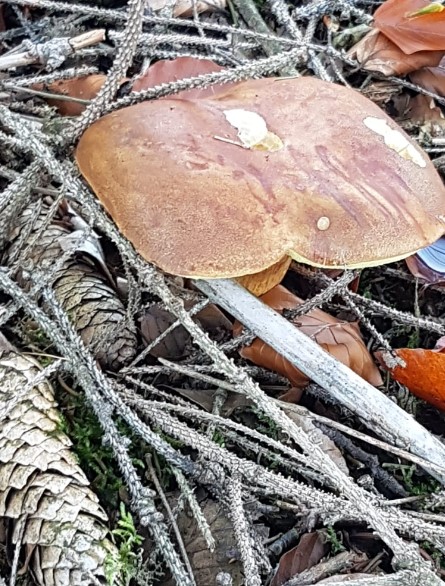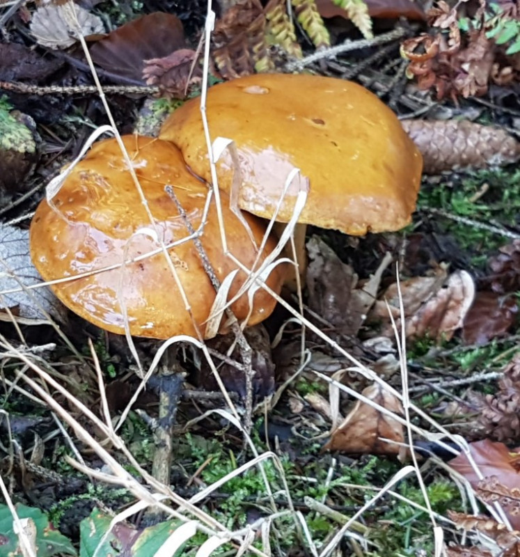 Bei dem helleren, schleimigen, denke ich zuerst an nen Goldröhrling, der wächst nur bei Lärchen, da liegen aber Laub und Fichtenzweige.