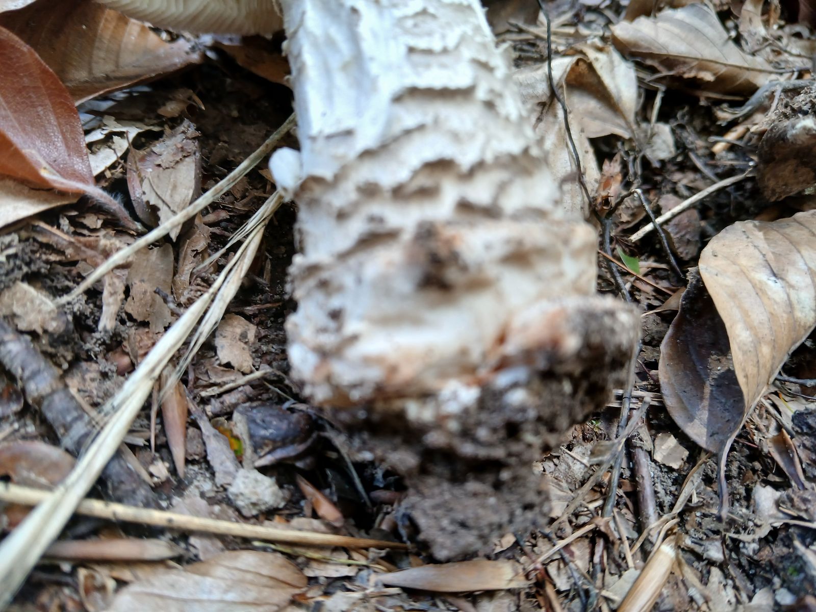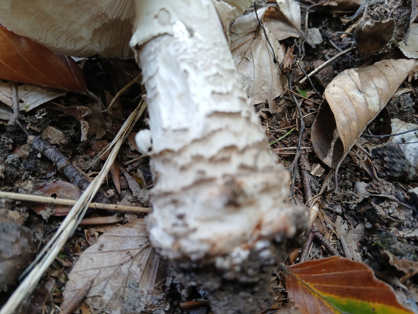 Dann habe ich drunter geguckt und bin wegen der Stielstruktur unter dem Ring noch mehr verunsichert. Ein Trockenschaden ist das nicht, denn der Fruchtkörper ist ansonsten in einem ganz passablen Zustand.