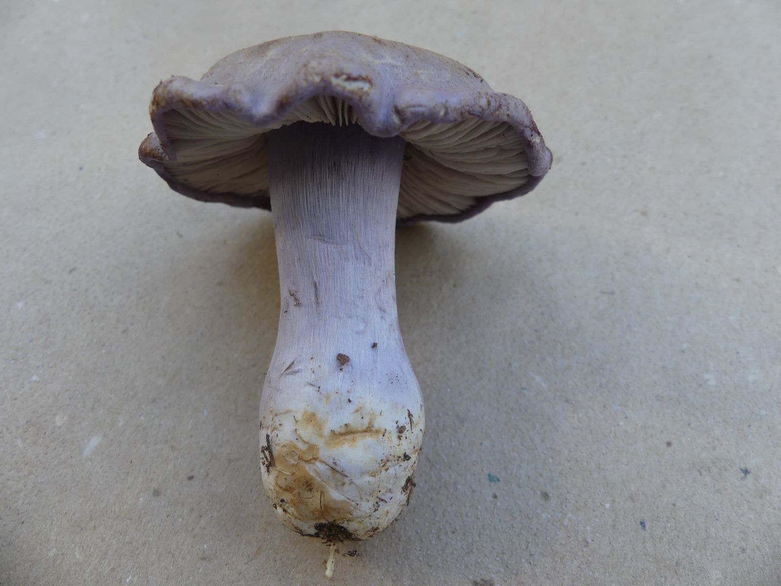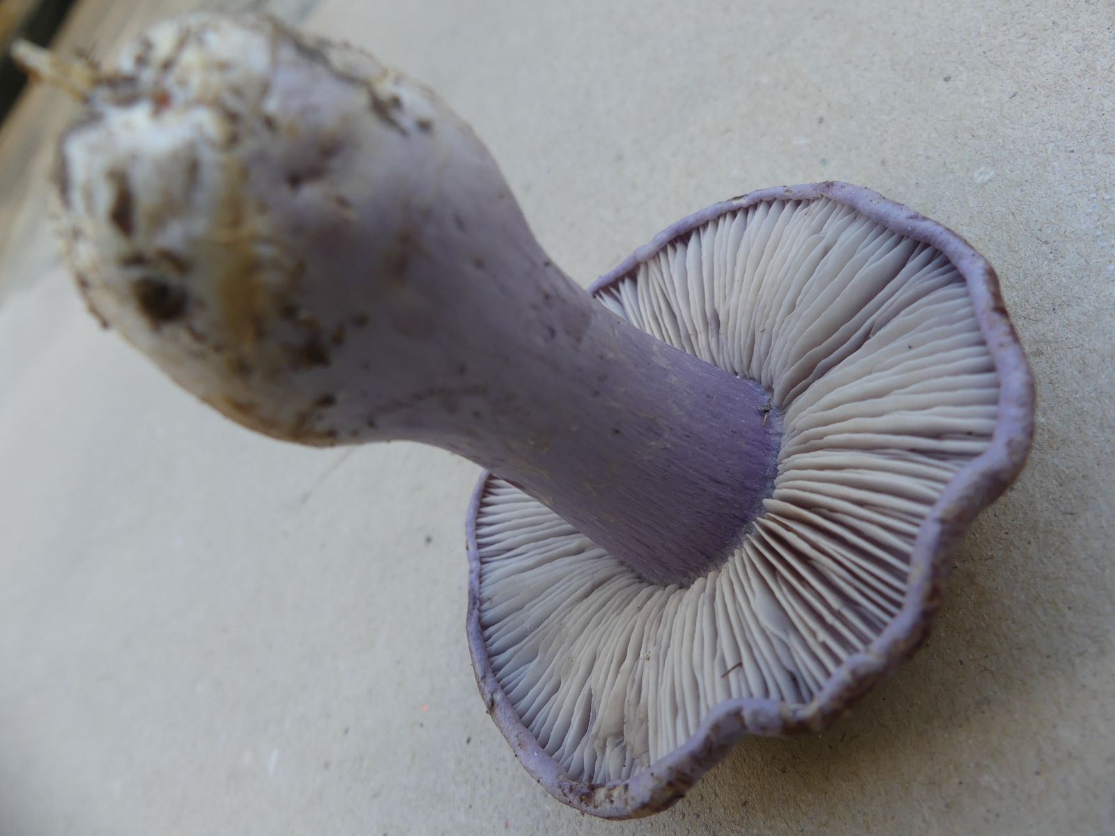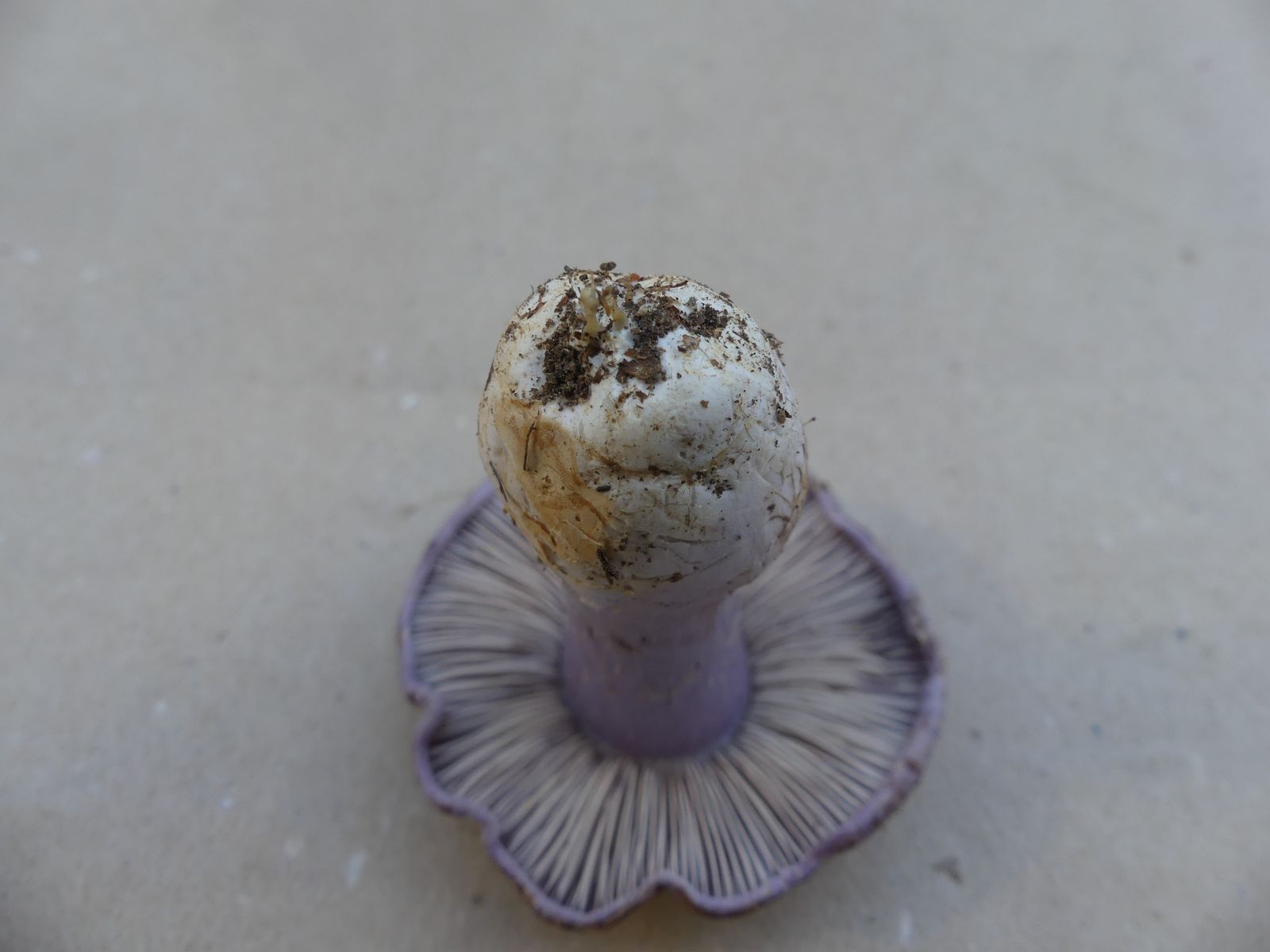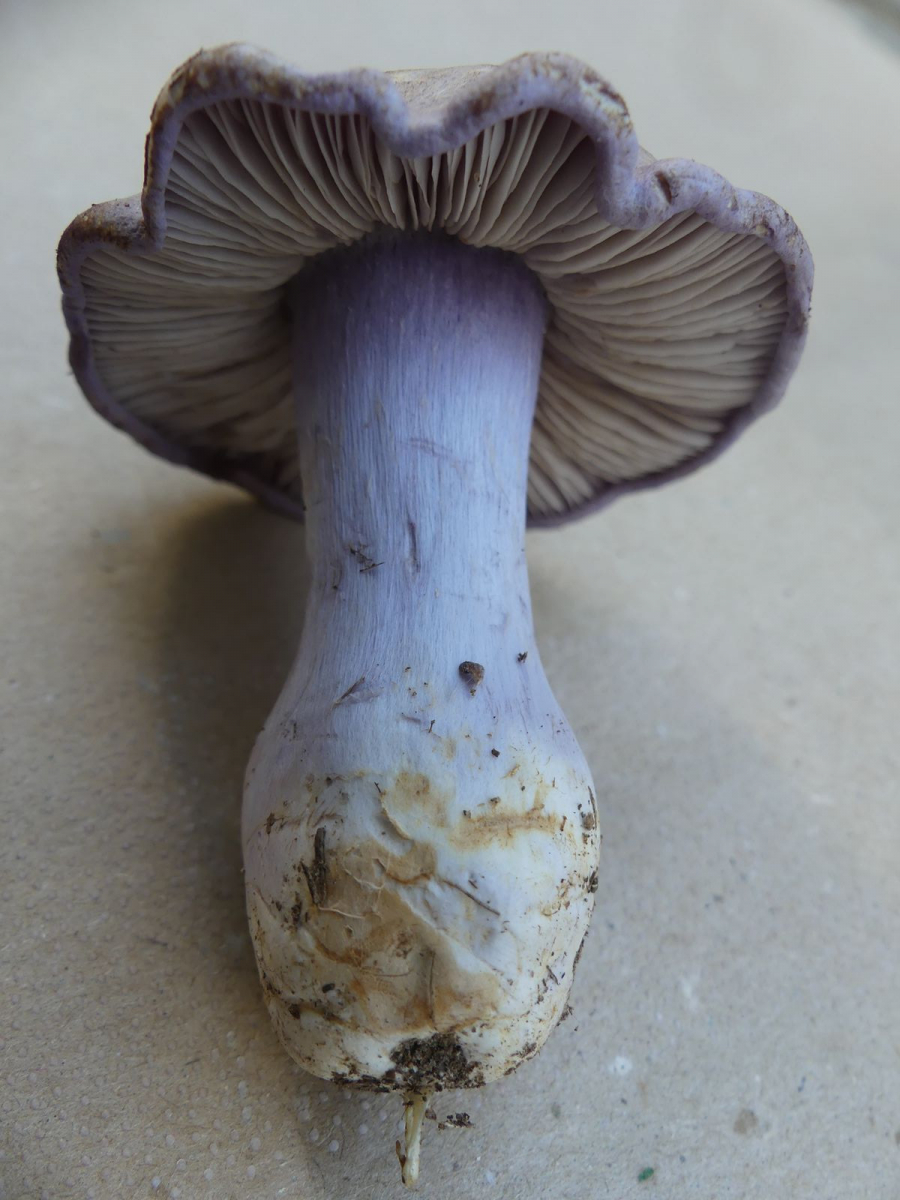 So heute, als ich diesen violettblauen Hut entdeckte. Ich dachte zunächst an einen violetten Rötelritterling oder eine Cortinarie, machte dann aber doch eine Kniebeuge.