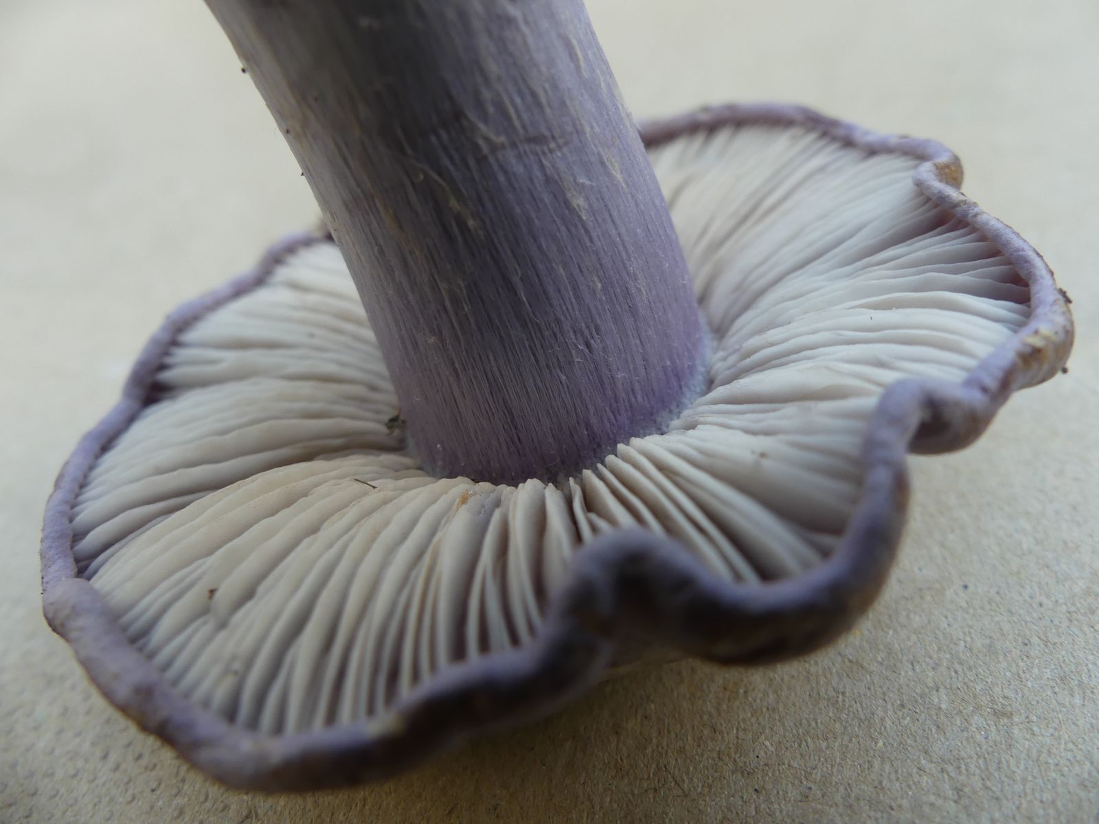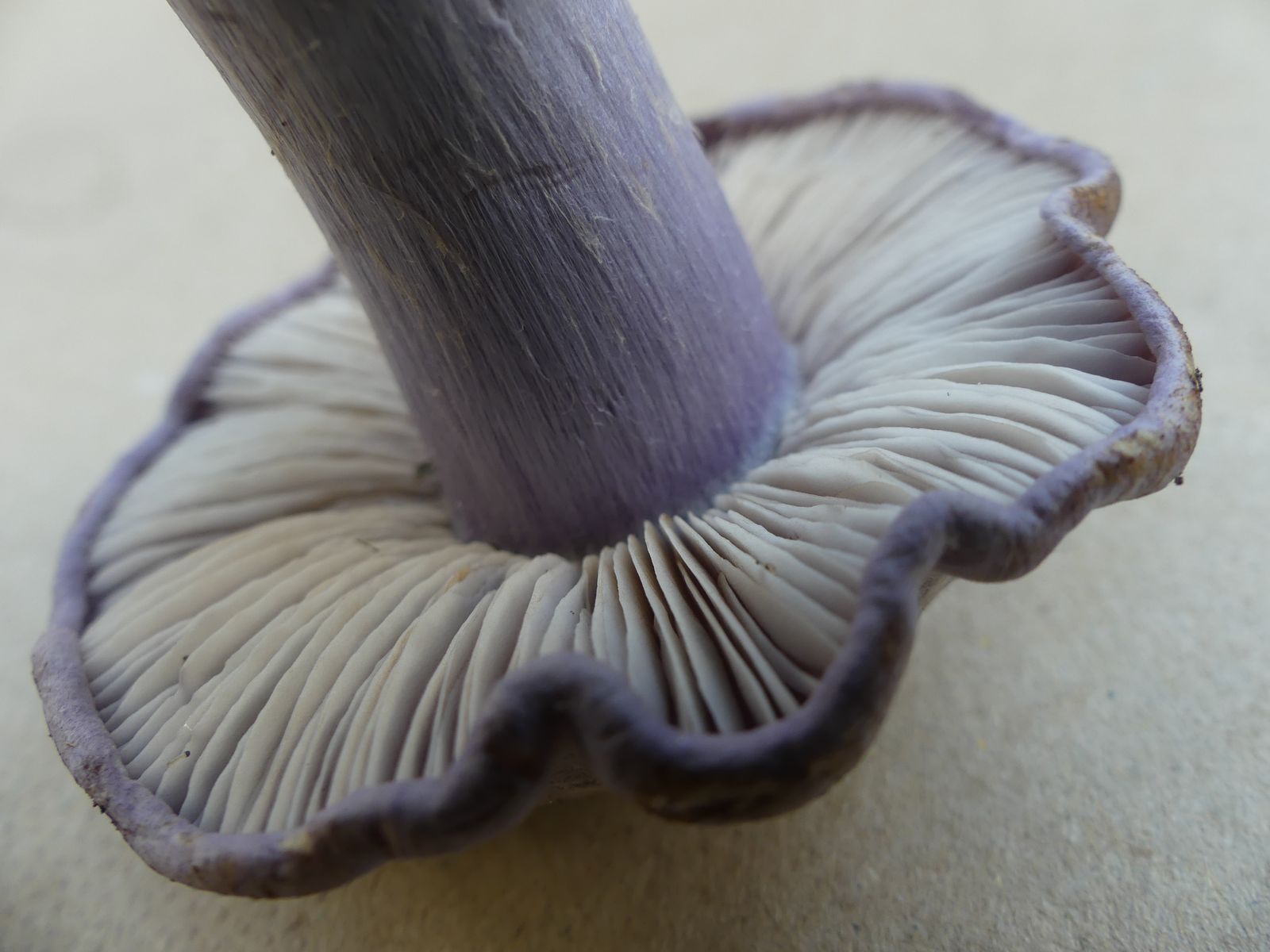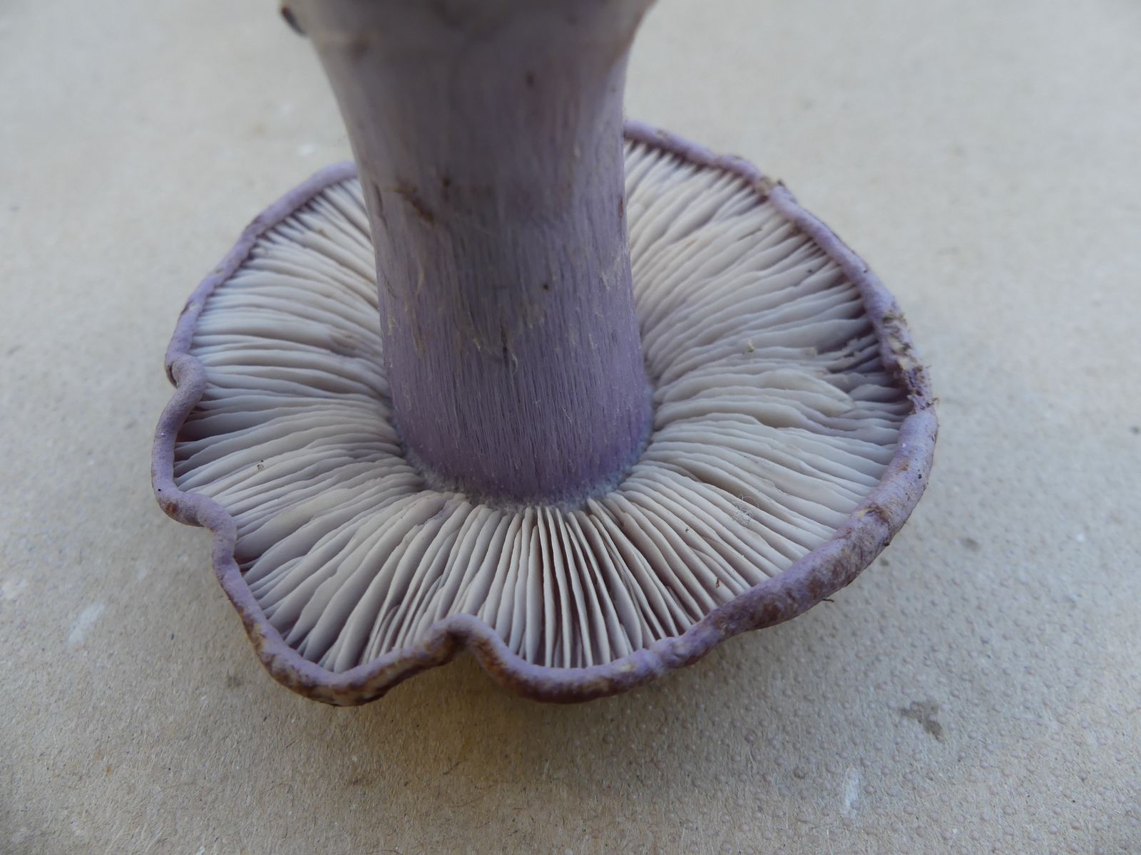 So heute, als ich diesen violettblauen Hut entdeckte. Ich dachte zunächst an einen violetten Rötelritterling oder eine Cortinarie, machte dann aber doch eine Kniebeuge.