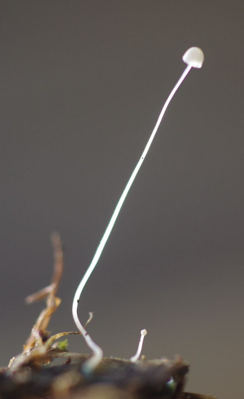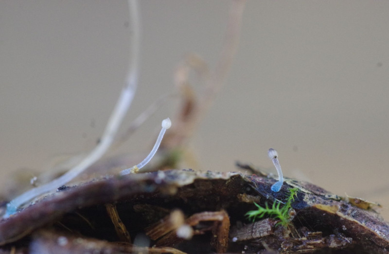 weil das gestern ein Einzelexemplar war und die Frage des Substrats unsicher war, habe ich heute nochmal geschaut. Unter der ersten Kiefer auf der Weide beim ersten Hinhocken gleich ein Treffer. Wobei ich das erst für Schwindlinge gehalten hatte, so klein wie die sind ... diesmal ordnungsgemäß auf einem Stück Kiefernrinde. Das große Exemplar ist über 20 mm hoch, der Hut hat einen Durchmesser von unter 1,5 mm. Der kleinste, besonders bläuliche passt ins Gesichtfeld, das 1,85 mm misst. Das gestrige Exemplar war also ein echter Riese.