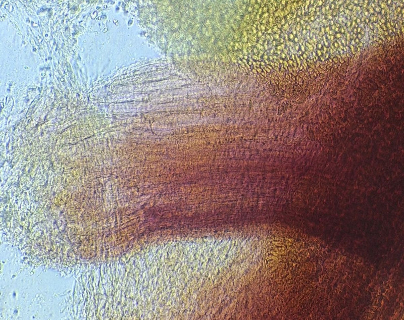 Lamelle, ziemlich unübersichtlich, aber es waren mycenatypische Sporen zu sehen und die Schneide voller gefingerter Cheilozystiden