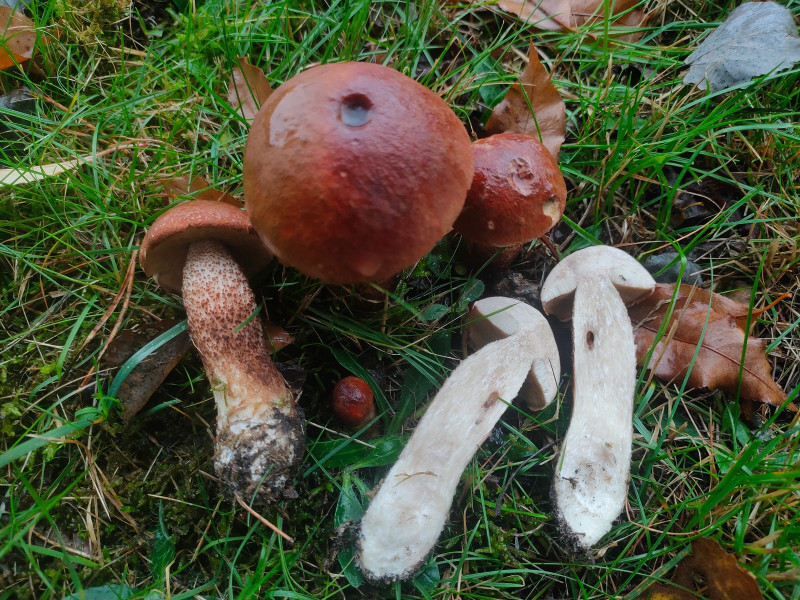 1. Amanita Beckeri: Ein junger ockerbrauner grauer Scheidenstreifling an der Grenze zum Mischbaubestand mit Quercus und Fagus, aber auch Pinus. Der Halbkugelige FK hat eine kurze Riefung und zeigt große Velumreststücke auf seinem Hut. Die Lamellen stehen dicht und sind zum Stiel hin abgerundet (siehe Schnittbild), Der Stiel ist weißlich überfasert und zeigt basal eine leichte Natterung. Die Vulva ist weiß, sehr brüchig. Eine Geschmacksprobe wurde nicht gemacht und der Geruch zeigt keine Auffälligkeit.