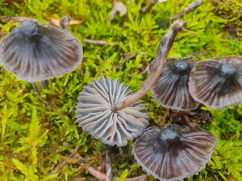 4. Entoloma cyanulum agg.: Ein sehr kleiner blaustieliger und blauhütiger Rötling, der bis zur Mitte gerieft ist und nur wenige weißen Lamellen den Stiel erreichen. Ich vermute die Art zumindest in seinem Dunstkreis. Ich könnte jetzt schon wieder schreiben...Mikroskop und Sequezierung dringend notwendig.