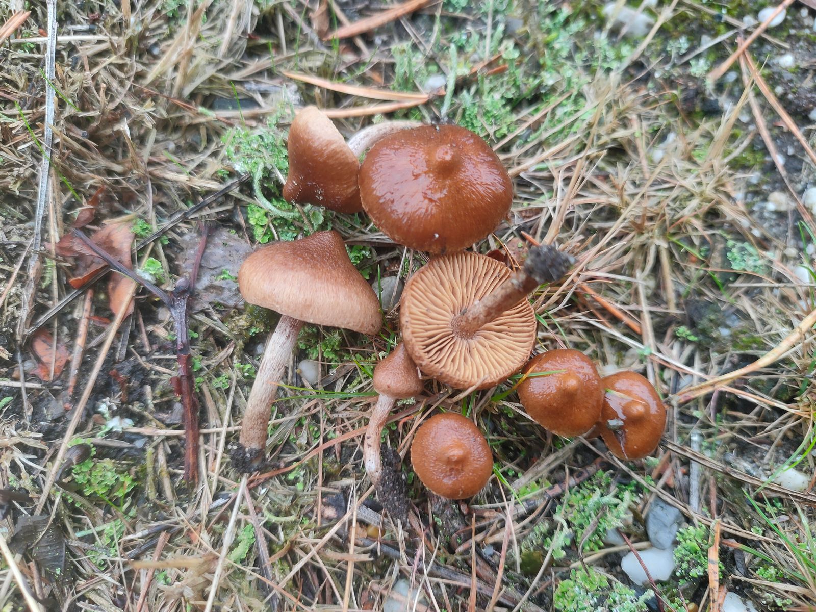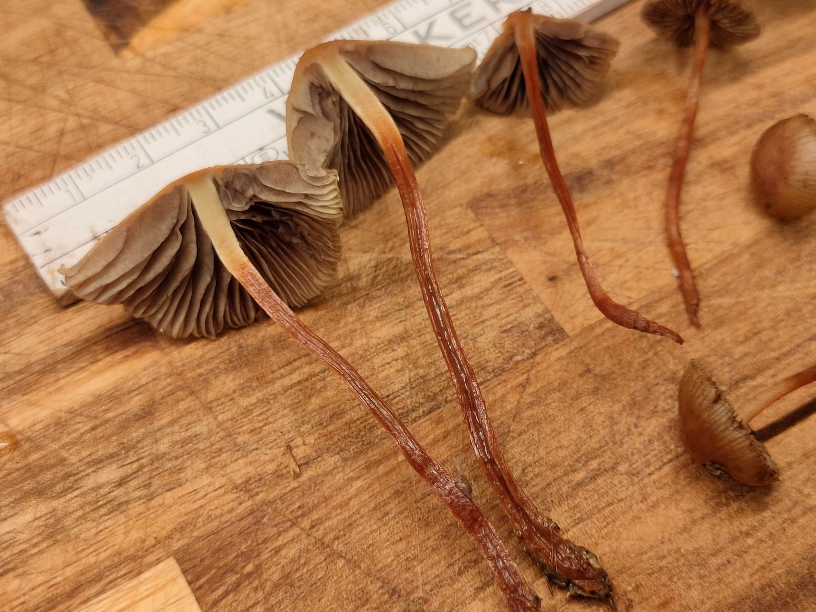 Zitat…..Makroskopische Beschreibung : Lebhaft orange-rötlich-brauner, helmlings-artiger Pilz mit auffallend starrem, mehrfarbigem Stiel. Hut 10-25 mm im Durch-messer, jung kegelig, bald ausgebreitet, aber nicht verflachend, stets mit zentralem Buckel, Rand gerieft, jung leicht eingerollt, alt unregelmäßig wellig verbogen. Hutfarbe orange-rötlich, zum Rand hin ockergelblich ausblassend. Huthaut glatt, speckig glänzend, hygrophan. Lamellen aufsteigend angewachsen, relativ engstehend, untermischt, jung strohfarben, dann hell ockerbräunlich, alt mit Grauton bis olivstichig. Stiel 60 x 2 mm, schlank zylindrisch, apikal leicht erweitert, hornartig starr, oberer Teil orangebraun, Richtung Stielbasis immer dunkler braun werdend. Stielbasis dunkelbraun mit Myzelfilz. Fleisch dünn, ohne besonderen Geruch und Geschmack. Sporenpulver hell schmutzigbraun……. Zitat ende
