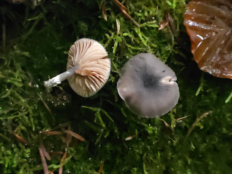 Ein winziger Rötling auf einem stark bemoosten Baumstumpf. Ich komme auch Entoloma brunneoserrulatum.