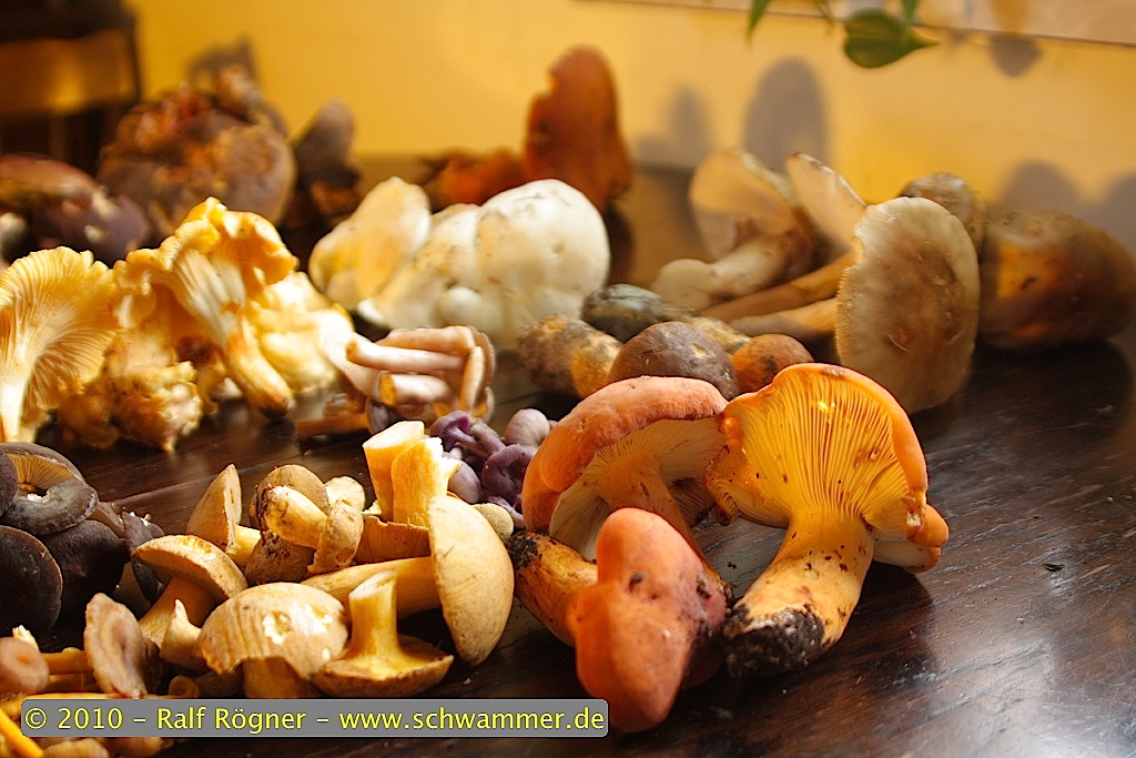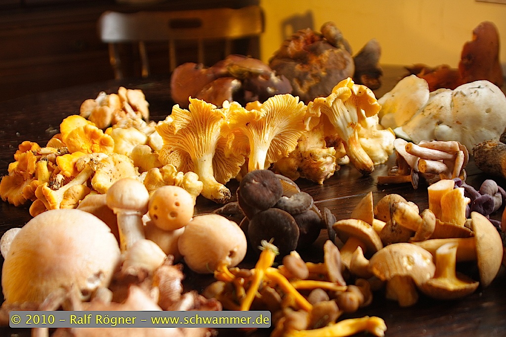 Im großen und ganzen setzt sich der heutige Fund aus diesen Arten zusammen: Bruchreizker, Butterröhrlinge, flockenstieliger Hexenröhrling, kleine Waldchampignons, Krause Glucke, Maronenröhrlinge, Milchbrätling, Mohrenkopfmilchlinge, Perlpilze, Pfifferlinge, Raufußröhrlinge (schwarzschuppige Rotkappe alias Birkenrotkappe), Reifpilze, Sandröhrlinge, Schafporlinge, Totentrompeten, Trompetenpfifferlinge und violette Lacktrichterlinge.