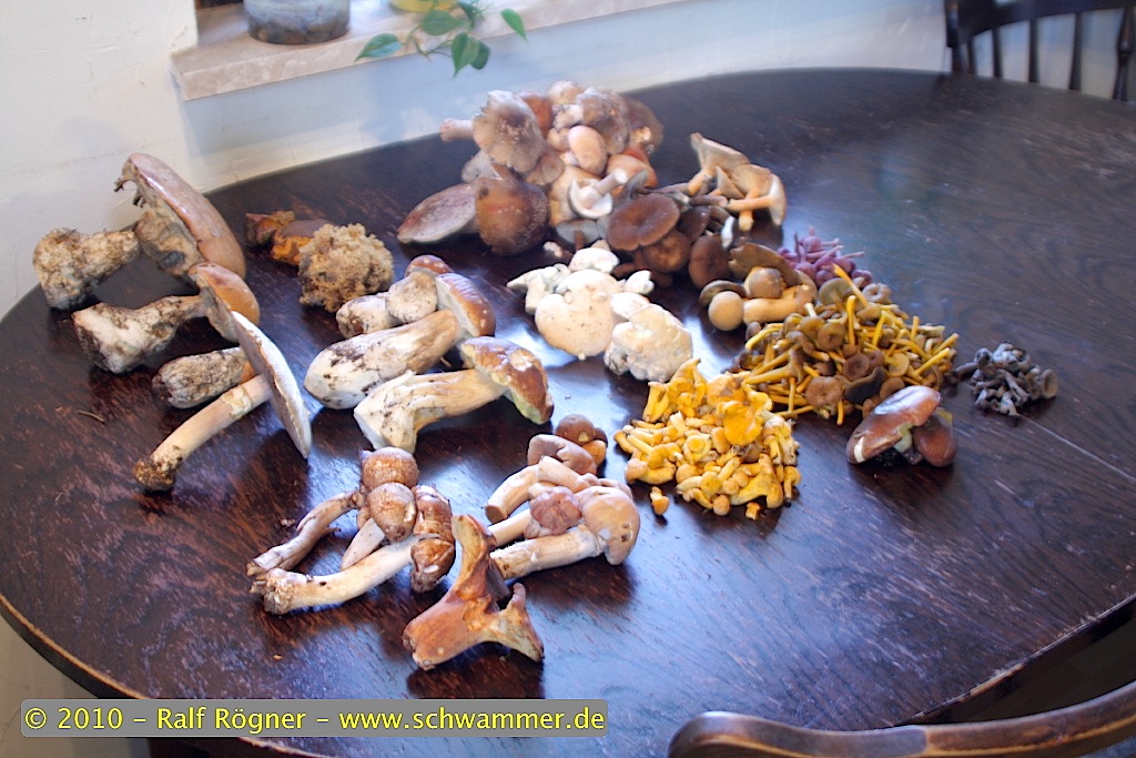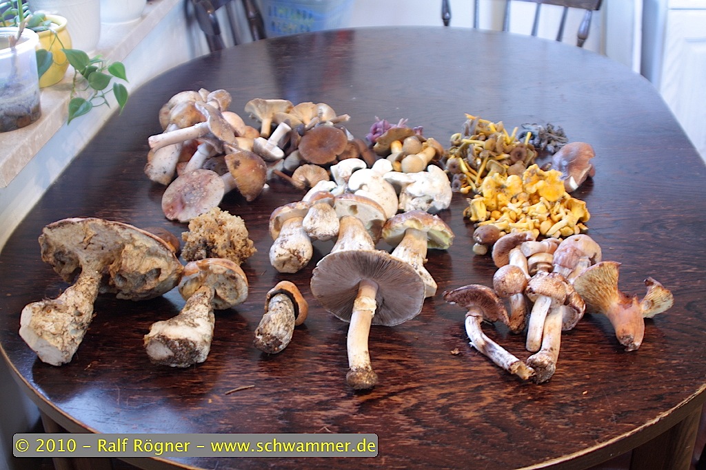 Im großen und ganzen setzt sich der heutige Fund aus diesen Arten zusammen: Bruchreizker, Butterröhrlinge, flockenstieliger Hexenröhrling, kleine Waldchampignons, Krause Glucke, Maronenröhrlinge, Milchbrätling, Mohrenkopfmilchlinge, Perlpilze, Pfifferlinge, Raufußröhrlinge (schwarzschuppige Rotkappe alias Birkenrotkappe), Reifpilze, Sandröhrlinge, Schafporlinge, Totentrompeten, Trompetenpfifferlinge und violette Lacktrichterlinge.